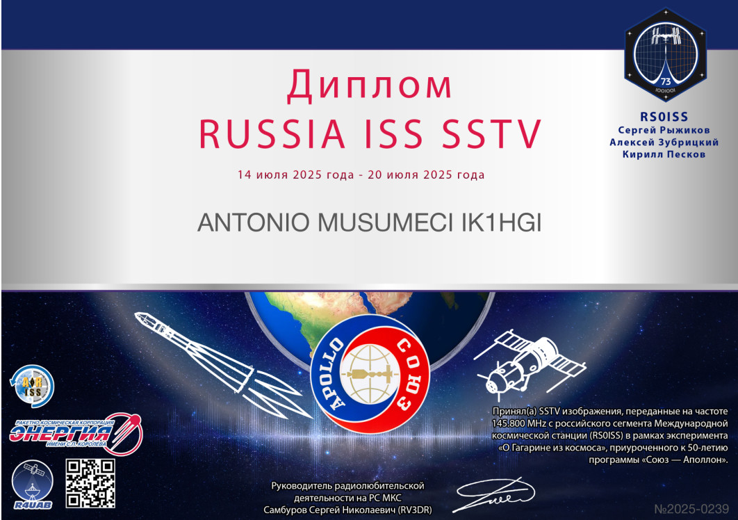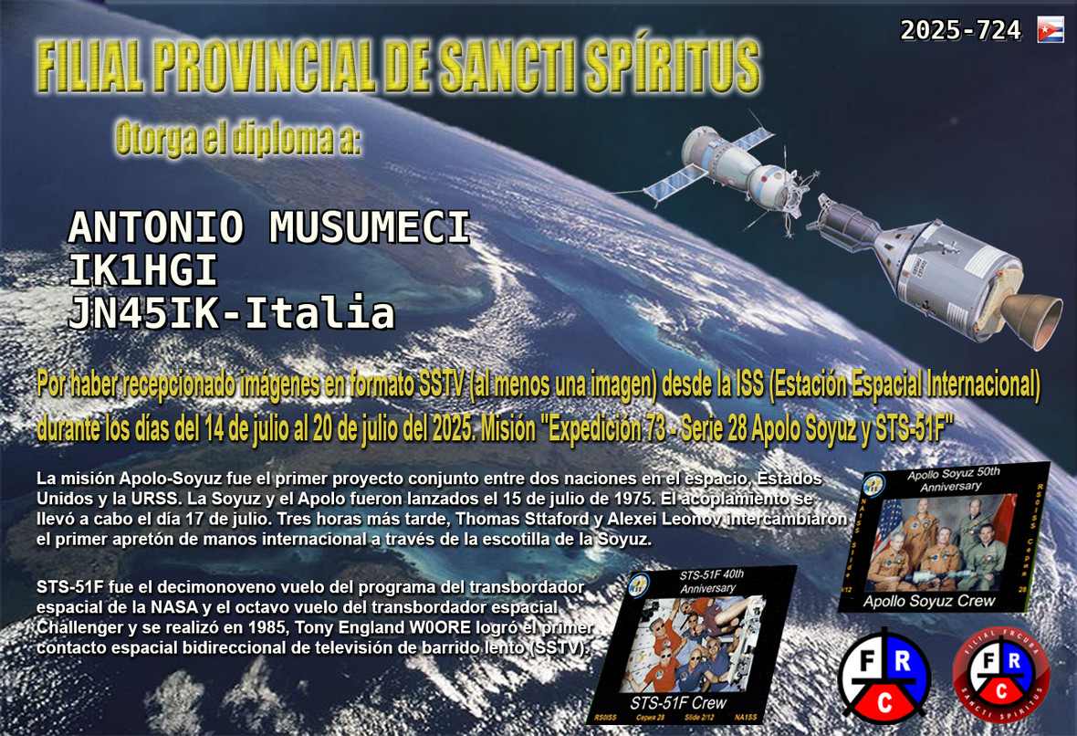 Missione "Expedition 73"Expedition 73 - ARISS Series 28Apollo Soyuz and STS-51F"La Filial Provincial de Sancti Spíritus quiere agradecerle su participación y otorgarle este diploma como constancia de la recepción por su parte de imágenes SSTV desde la ISS, motivo "Expedición 73 - Serie 28 Apolo Soyuz y STS-51F https://drive.google.com/drive/ |