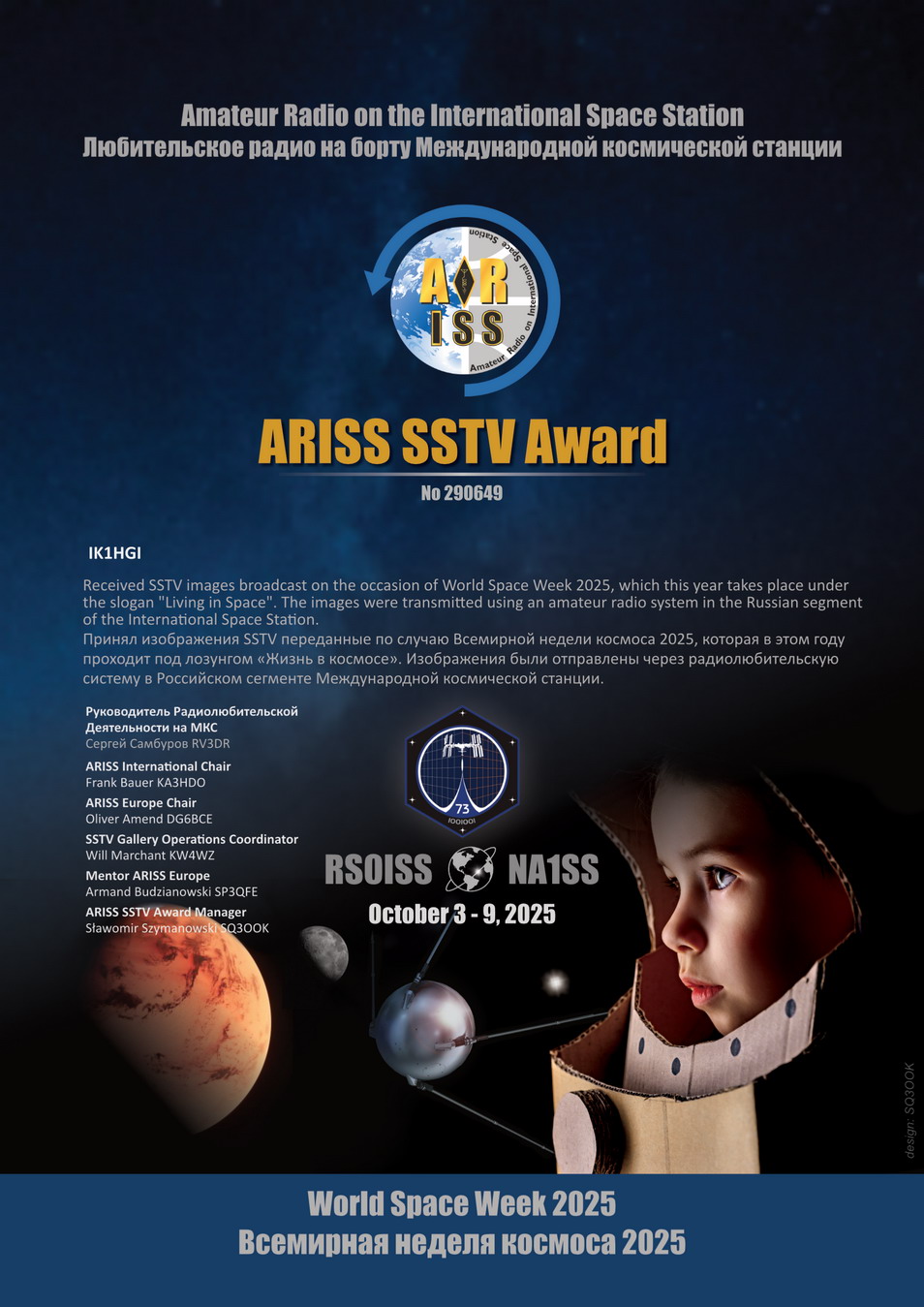 Ham Satellite PR SSTV on ISS 2025 "Expedition 72 - Series 22 Slawek SQ3OOK, ARISS SSTV Award Manager Mar 05-05, 2025 10 MAGGIO 2025 ricevuta