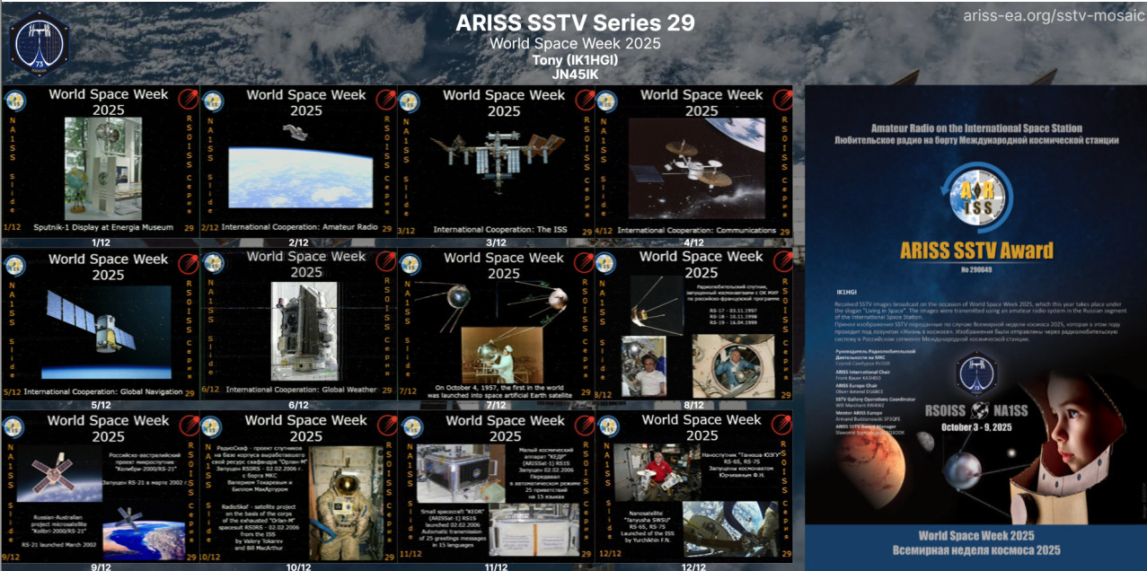 ARISS SSTV - ARISS Series 29 World Space Week 2025 Ottobre 03-06, 2025.La Radioamatoriale sulla Stazione Spaziale Internazionale (ARISS) è un'iniziativa cooperativa tra le società internazionali di radioamatori e le agenzie spaziali che supportano la Stazione Spaziale Internazionale (ISS). L'obiettivo principale di ARISS è promuovere l'esplorazione scientifica, https://drive.google.com/drive/ |