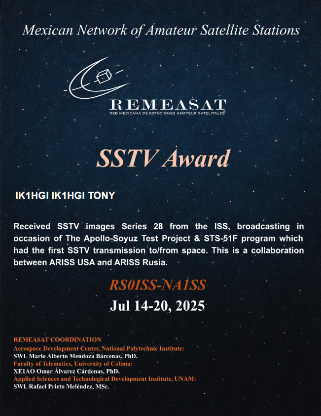 Missione "Expedition73 - ARISS Serie 27"Frequenza: 145.800 MHz. Modalità SSTV: PD120. DATA: DAL 5 AL 12 maggio 2025. La Sezione di Sancti Spíritus ringraziarvi per la vostra partecipazione e ti rilasciamo questo diploma come prova di ricezione per la sua parte di immagini SSTV dalla ISS, grazie della vostra collaborazione 73 ik1hgi Tony |
