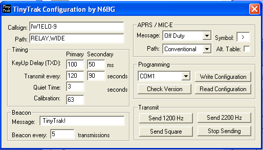 Non rimane che programmare il CIP. Scaricatevi il file tinytrakv14,e inserite nel PIC il file vergine "Tinytrak.hex". Per fare questa operazione potrete utilizzare un comunissimo programmatore di PIC/EPROM oppure l'ormai blasonato LUDIPIPO, che permetterà appunto di inizializzare il PIC con il FIRMWARE necessario ad accogliere la programmazione della nostra stazione mobile di radio localizzazione. Fatta questa operazione colleghiamo il TinyTrack al PC con un cavetto seriale, e eseguiamo il file "TinyTrakConfig.exe". Si aprirà una finestra come l'immagine di seguito riportata. Non dobbiamo cambiare tantissimi paramentri; sicuramente al posto di NOCALL in Callsign, metteremo il nostro QRZ con il SSID -9 (di solito si identificano così le stazioni mobili), mentre il Beacon lo lascierei stare ogni 5 minuti, poi vedete voi, aumentrlo genera solo più traffico sulla isofrequenza APRS (144.800 MHz per le VHF). Ci sarebbe un ultimo parametro da cambiare che è il Symbol; lasciando " > " otterrete il simbolino dell'automobile che verrà visionato come tale sui programmi utilizzati per il tracker APRS. Finita la modifica dei vari paramentri non vi simane che premere il pulsante WRITE CONFIGURATION e il vostro Tiny Trak sarà pronto per essere collegato al GPS e alla RADIO per trasmettere la posizione geografica.