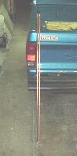 I was flipping through some old 73 magazines I picked up at a hamfest and found an article by George Ewing, WA8WTE who described a method of making mobile antenna masts out of 1/2" copper water pipe. I didn't like some of the ways he did things, so I spent some time in the workshop and came up with the following plan to make my own, which I think looks better and has a fewer parts count. The materials listed here are enough to make 2 complete masts with very little left over. Total cost at the time of this writing was $8.75 from the local Home Cheapo store, less that $5 per mast. You may wonder, why build two and not just one? Simple. The pipe comes in 10 foot lengths which is enough to build two, and the extra parts to build the second one are only a couple of bucks. Once you've got all the tools dug out it only takes a few extra minutes to finish a second mast, so you can have a spare for when you back into the garage without taking the mast off first like I am prone to do.