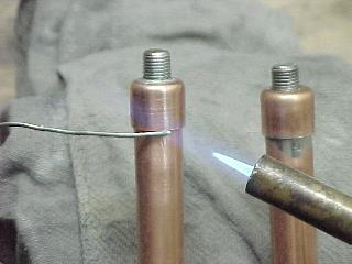 Holding the bolt end with a pliers or vise, heat the bolt/cap assembly with a torch and fill the cap with solder, up to the level of the top of the bolt head. I used regular 63/37 solder and pipe soldering flux. There was no problem getting the solder to wet the steel bolt head to the copper cap. Repeat this process for the other three pipe caps. |