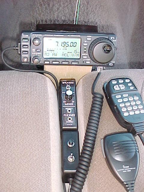For long trips I've got an Icom IC706 that I made an almost no-holes installation for. The control head, Yaesu ATAS-100 remote antenna control box and audio mixer control box all mount to a wooden affair that merely fits between the seats. The transeiver and antenna control box are remotely located from the driver's position to the rear passenger seat, and since it's not intended to be a permanent installation, they just rest on the floor. A custom bracket mounted to the steel underpinning of the rear bumper hold the Yaesu ATAS-100 HF mobile antenna, which can quickly be removed when not operating. The only hole drilled was a 3/4" one throught the plastic rear bumper.