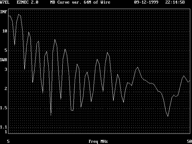 (a stylistic note: all graphics in the table below link to full displays) This survey reveals that taking a length of wire and applying almost any folding to it will allow it to retain its spectrum of resonances. By this I mean that it will resonate at intervals roughly matching the resonances of the monopole it is derived from. 64 MetersThe table that follows contains Reference and Fractal Antennas SWR spectrums for designs consuming 64 meter of wire. It should be noted that due to the manner in which wire is consumed (bent and turned away from the vertical, or reversed), all fractals are much smaller than 64 meters tall. Observe also that the smaller fractal antennas produce nearly as many resonances as the large radiator. The interesting trend displaying separable features is found in three fractals, the Triadic, M-B Curve, and Z-Fold, showing progressive smoothing of their high Z SWRs in the upper band. The relationships displayed here are a one-to-one correlation of this trend with complexity. |