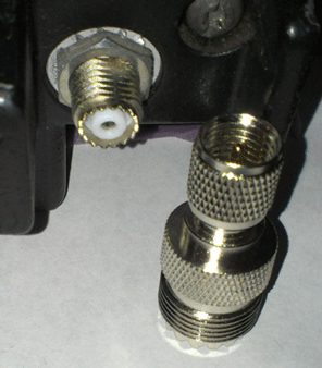 The antenna connector on the back of these radios is called a "Mini UHF". As you can see in the image to the left, I use an adapter to allow a more standard "PL 259" connector to be used. |