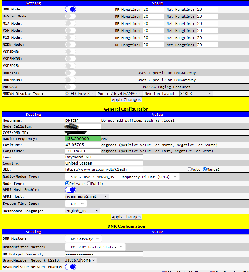 Some modes, like: YSF2DMR, YSF2NXDN, YSF2P25, DMR2YSF, DMR2NXDN and POCSAG can be used together but may have to be used separate from their counterparts. If you do any changes here, you MAY have to reenter your BrandMeister password since the DMR Net field in the Network status field of your dashboard will be YELLOW.