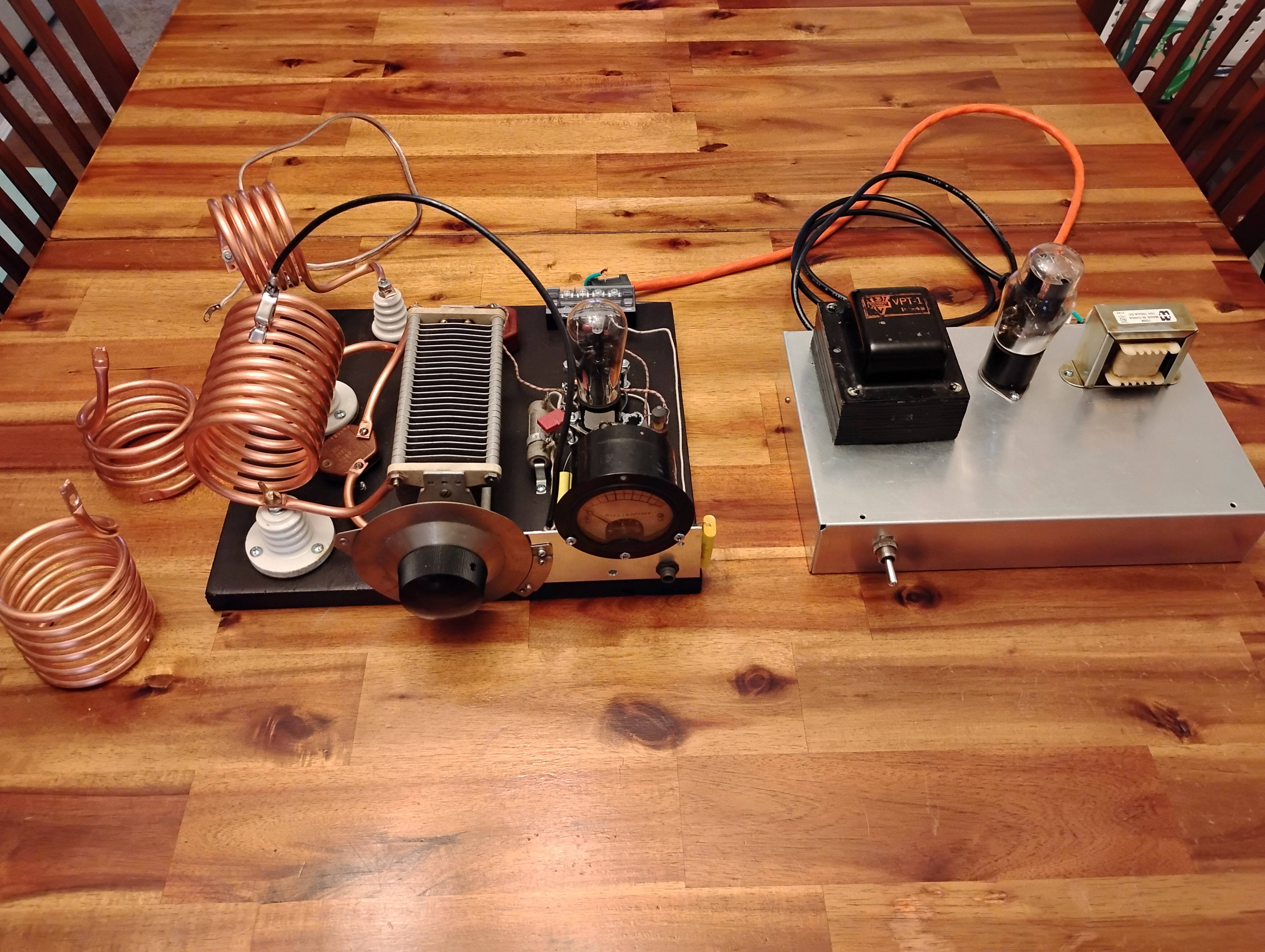 The single 27 draws about 40mA at 200V key-down, so 8W input. It outputs 3W and 40m/80m and 2W on 20m. A second tube socket was installed for paralleled tubes, but that wasn't ready this year.