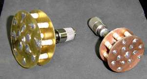 Este es un diseño aportado por Carlos LU2CRM, al cual modifiqué algunos detalles, y que he utilizado para varias Dummy Loads de diferentes valores con buenos resultados tanto técnicos como estéticos. El diseño original prevee conectar 13 resistores de 680 Ω, de 2W de disipación entre dos discos de chapa de bronce o cobre, de un diámetro de 70 mm. dispuestos en dos círculos concéntricos, y espaciando equidistante cada resistor. La conexión se realiza con un cable coaxial de dieléctrico de teflon, para poder soldar la malla firmemente a la chapa sin deteriorar el aislante. Para esto último se realiza en una de las chapas, una perforación central por la que pasa el coaxial al cual solo se le retiró el aislante exterior, mientras que en la restante la perforación se realiza del diámetro necesario para pasar el conductor central del cable. |