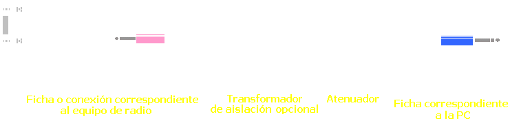 1 _ Acoplamiento de audio desde la salida de parlante o data del TRX al micrófono de la PC. 2 _ Acoplamiento de audio desde la salida de la placa de sonido al micrófono de nuestro TRX. 3 _ Accionamiento del PTT o puesta en TX ( transmisión ) del equipo de radio por el PC.