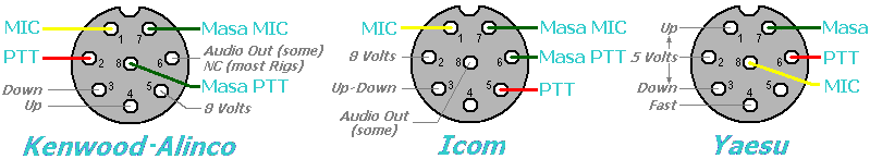 Información Anexa : Pinouts Los pinouts de las fichas de micrófono habitualmente aparecen en los manuales de cada equipo. Los más comunes se muestran a continuación. Recuerde que la numeración está indicada en el cuerpo de la ficha (ver con una lupa). |