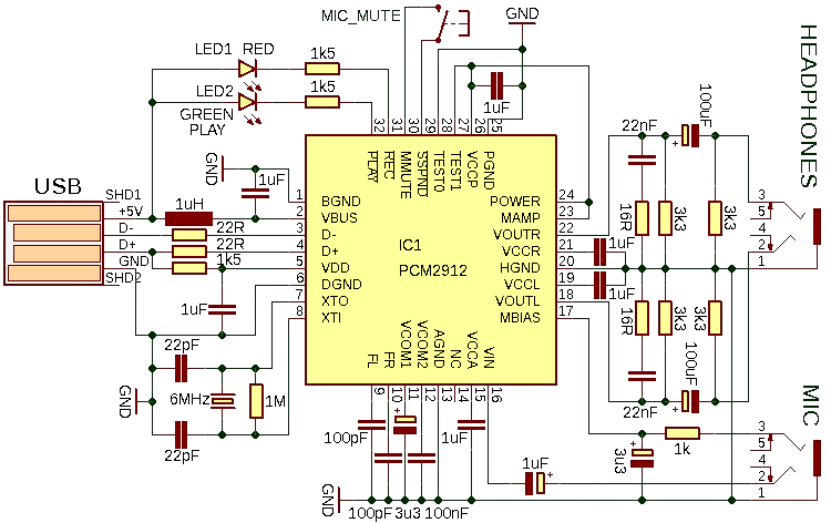 Circuito típico de una Placa de Sonido USB Al igual que con los adaptadores RS232, las placas de sonido USB pueden ser construídas de forma amateur, pero al igual que aquellas, los integrados específicos también son de montaje superficial y de muy reducido tamaño. Aún así se pueden encontrar en Internet varios diseños de PCB de placas de sonido USB que facilitan la construcción de la mismas. |