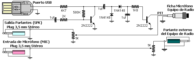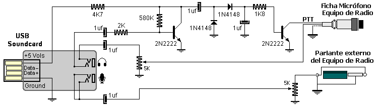 PTT por Placa de Sonido USB La aparición de placas de sonido USB ha facilitado la realización de interfaces muy compactas, con un mímimo cableado e incluso económicas. La estrategia es utilizar estas placas en reemplazo de la placa de sonido de la PC o Notebook, y tomar del propio conector USB la alimentación necesaria para accionar un sensible circuito VOX, resumiendo así toda conexión a la PC a solo un conector. |