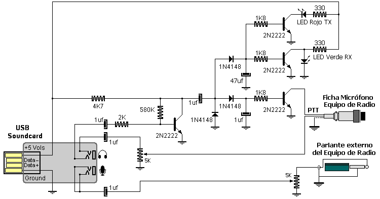 PTT por VOX alimentado desde puerto USB Ya se mencionó en la nota de Interfases Digitales la posibilidad de accionar el PTT utilizando la función VOX del propio equipo de radio, e incluso se incluyó un circuito VOX para aquellos que no la tengan disponible. En el caso de circuitos sin alimentación externa, para provocar el disparo del circuito, es necesario un nivel de audio considerable al que algunas placas de sonido no alcanzan. Por otro lado, los circuitos más elaborados, con alimentación externa, solucionan el problema del accionamiento con bajos niveles de audio, pero complican el cableado y las conexiones. La solución mas aceptable para alimentar un VOX es tomar tensión del puerto USB, donde están disponibles + 5 Volts y el cableado se reduce a una ficha más, que habitualmente se encuentra cerca de las salidas de audio. |