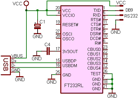 Aún con los inconveniente mencionados, la opción del adaptador es aceptable y quizá la única para sistemas de control y transferencia de datos, como en los CAT u otros similares. Los adaptadores pueden armarse, ya que los integrados específicos se consiguen, al igual que la documentación de circuitos y los drivers; sin embargo, el costo del integrado, por ejemplo un FT232RL, suele superar a los adaptadores comerciales terminados; hay que sumar el costo de las fichas USB y DB9, la plaqueta de montaje, y algo importante a tenerse en cuenta: el integrado de 28 pines mide 8 x 10 mm, y la separación entre pines es de solo 3 décimas de milímetro, lo cual hace más complicada la plaqueta de montaje y la soldadura. Para quienes estén interesados, los circuitos están disponibles en la hoja de datos del integrado; la imagen es uno de los mas simples. |