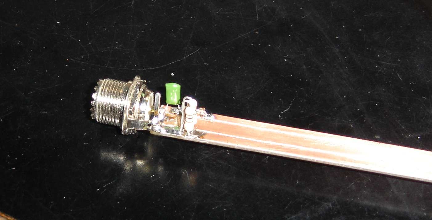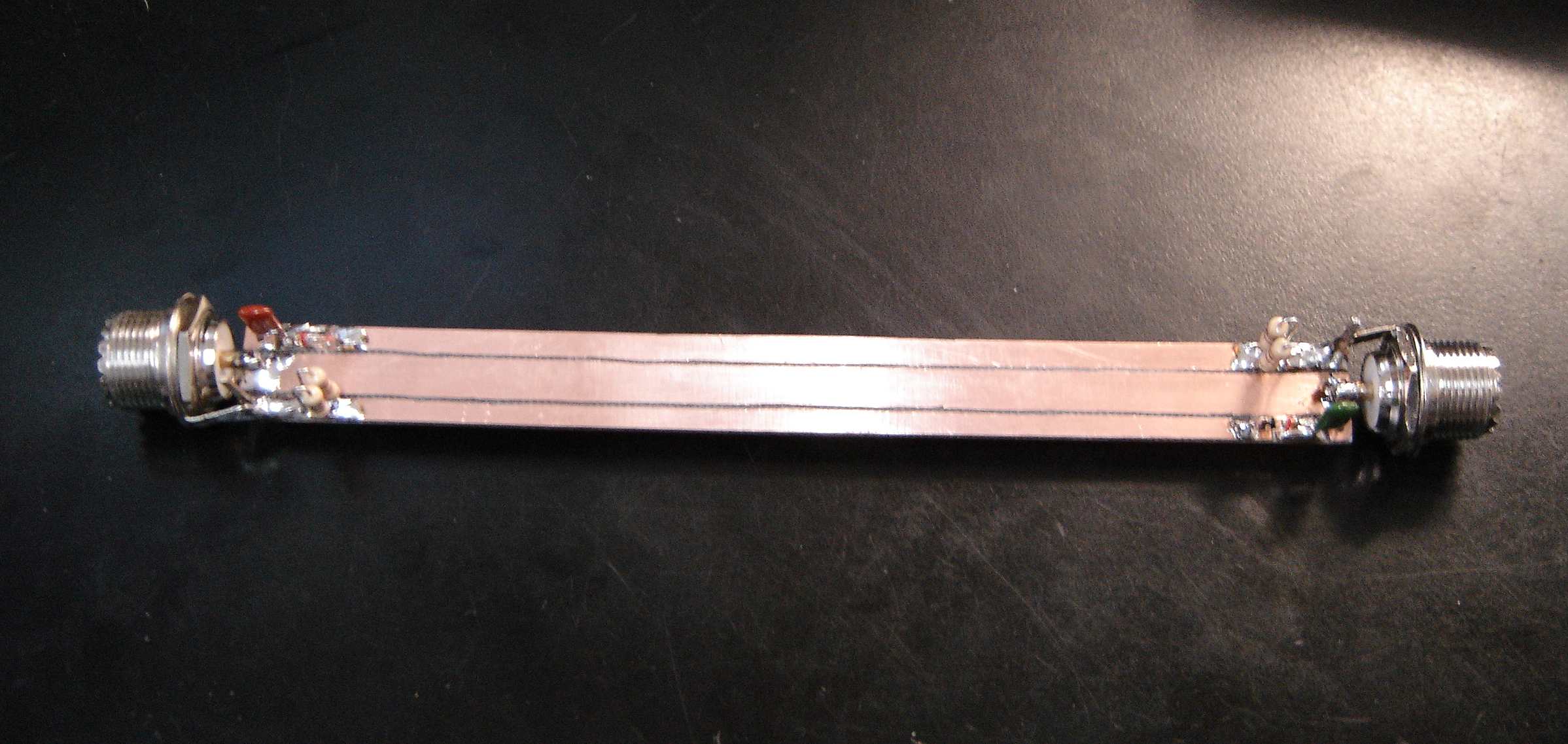 En la línea central, e indistintamente ya que como se aprecia ambos extremos son idénticos, se soldarán los conectores del transmisor y antena; de ser necesario, se pueden emplear cables coaxiales para llegar hasta los mismos, en los casos en que no sea posible ubicar la plaqueta directamente soldada a ellos. |