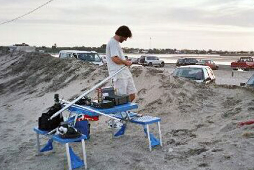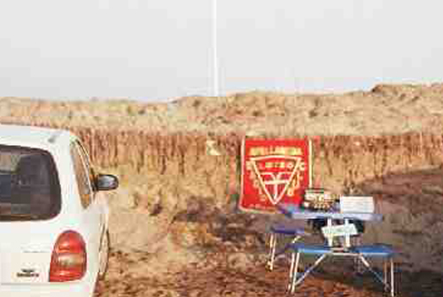 Una delgada playa y la calle de acceso separan unos 100 metros el mar de la "boca"; Qué mejor lugar para activar esta laguna ? . Sobre la parte alta de la playa y ante la sorpresa y curiosidad de los bañistas y pescadores, colocamos la mesita plástica con los equipos, instalamos el mástil, izamos el dipolo, colocamos el estandarte del Club .... y a llamar CQ !!