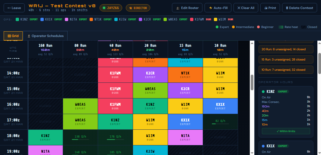 The director (that's you) sets up the contest once: enter the contest name and callsign, pick your start time in UTC, configure your stations and their bands, add your operators with their skill levels, and set your scheduling rules. The app generates a schedule grid - time runs down the left axis in UTC, stations run across the top - and you're ready to go. From there, operators join by visiting the link you send them on their phone or laptop, and log-in with their call sign. No accounts, no passwords. They see the same live grid you do. When they want a shift, they tap the cell to claim it. When they don't want a shift, they tap to release it. Every change appears on every screen within seconds.