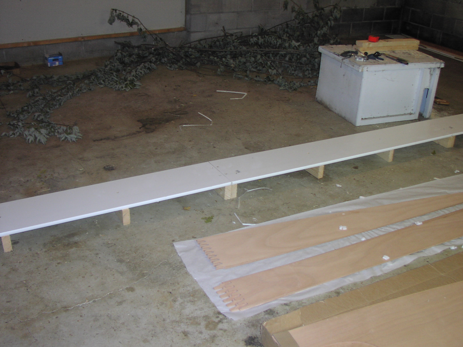 The right picture shows more of a side view. The "joists" are 24 inches apart, which is probably over kill for the weight the table needs to support. The end "joists" are held by 2 screws, the others only one. Each table segment is held to its neighbor by a carriage bolt. The table top is 73" (long) by 11 - 1/4" (wide) cheap shelving. So my table is 18' 3" by 11 - 1/4 ". You may wonder why I didn't make it taller. It will only be used for epoxying panels together. I didn't think it was worth it to make it a more ergonomic height. Besides, it would take more lumber.