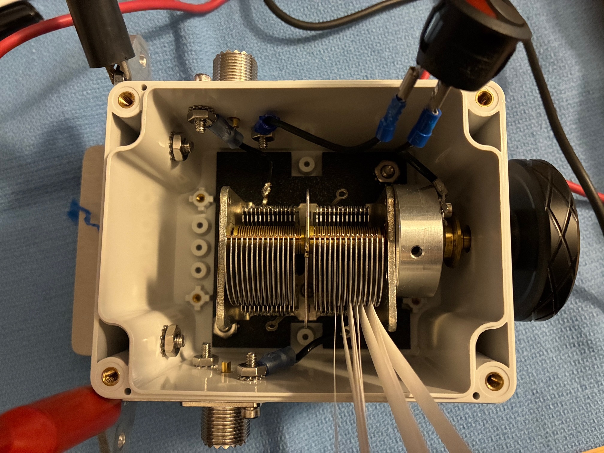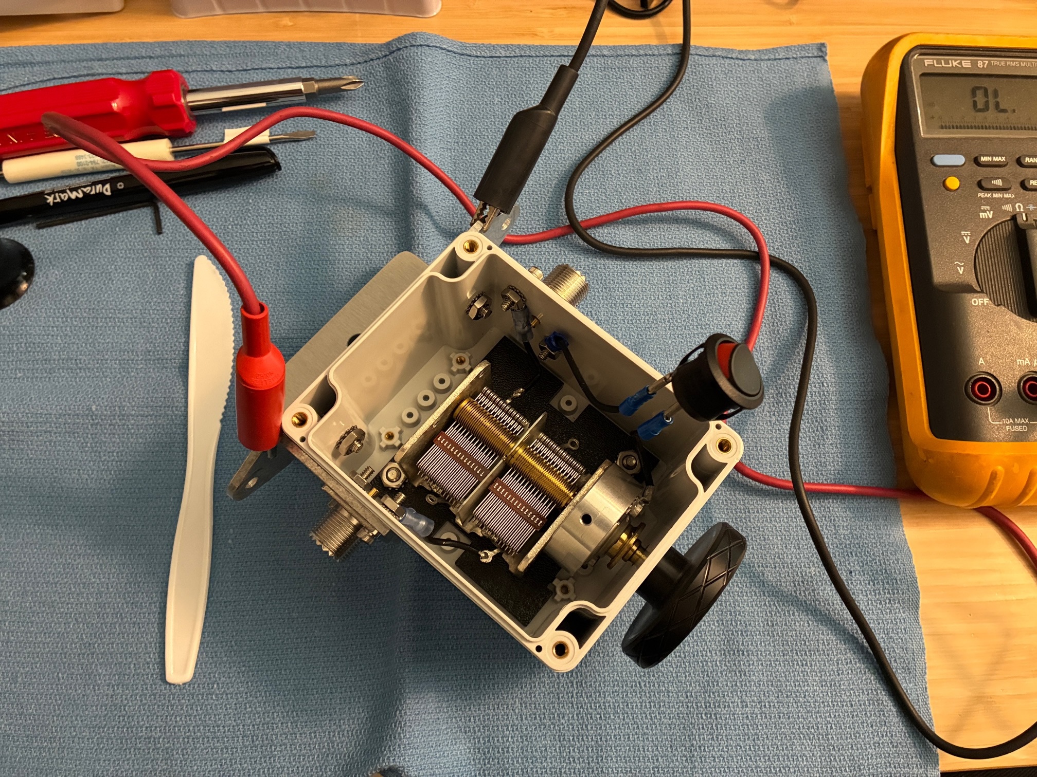 I had the idea to check for capacitor shorts using my DMM connected between the two SO-239 jacks (rear ear flanges). It was not as easy to get out a capacitance meter and start measuring the variable cap. Have in the past seen variable capacitors short in certain spots from RF arcs burning the individual capacitor plates to their neighbor. Was worried that this might be the case today even though I've never used more than 10W from the IC-705 with this antenna. Hooked up the DMM and set to measure OHM and beep on low-resistance/short.