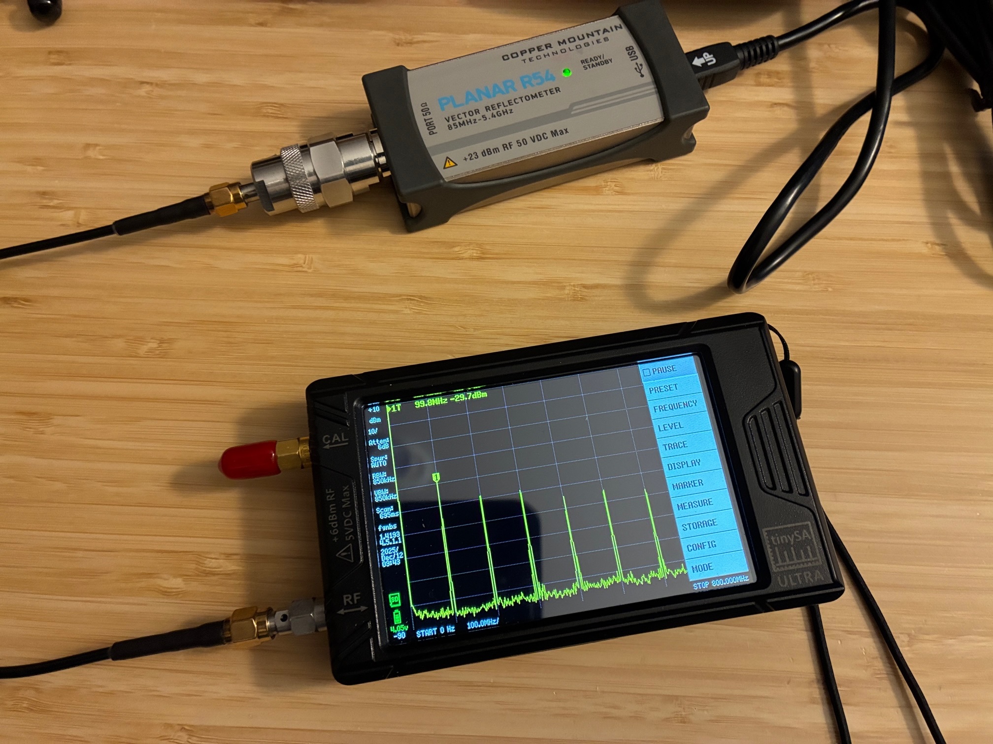 First up is measuring High power. The software setting is shown below, followed by a zoomed out view of the test setup, and finally a zoom in on the TinySA screen showing the marker level of the R54 probe's output.