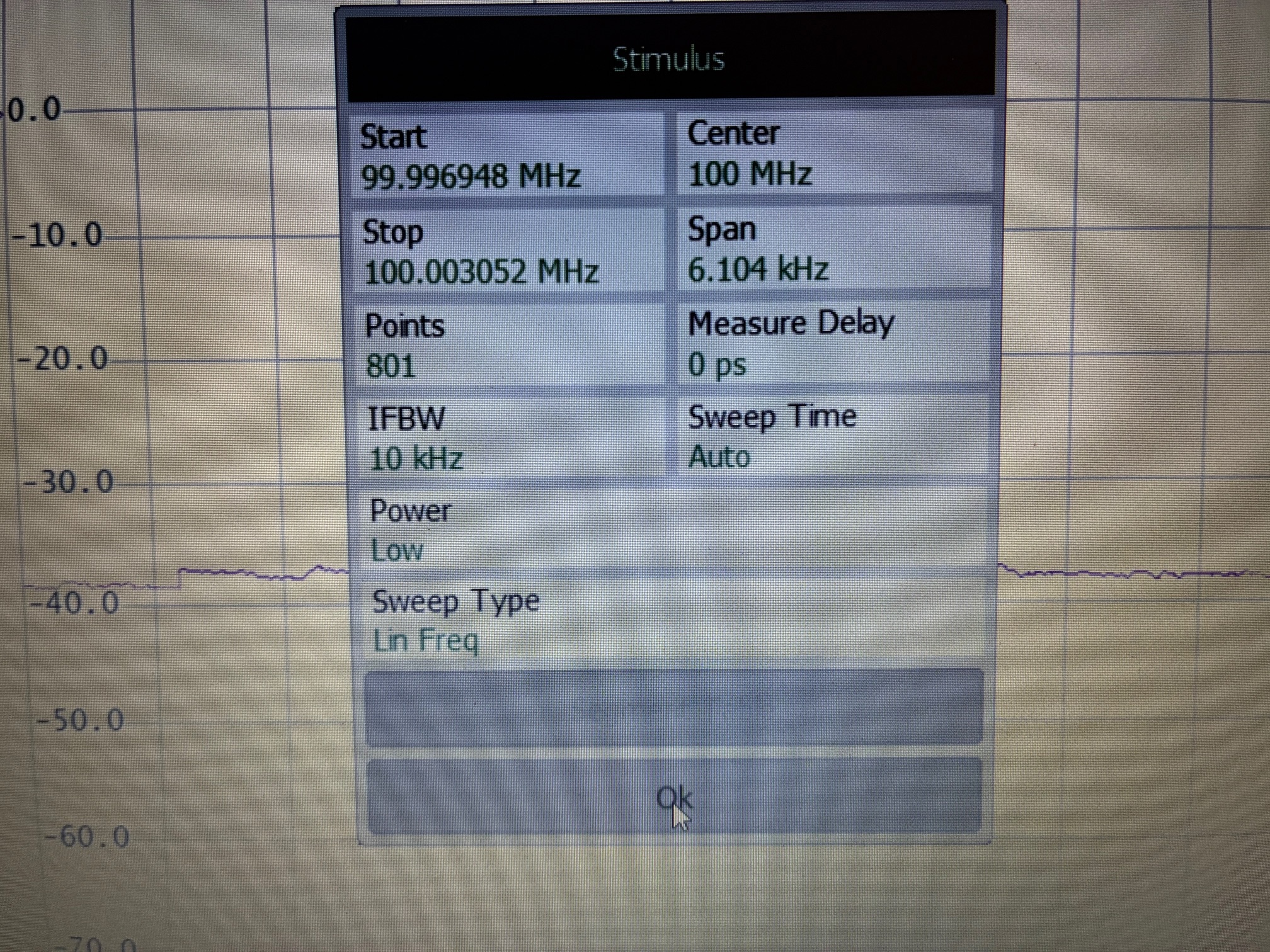 The CMT R54 software provides a two state power level setting with the device specifications listing a value of -10 dBm for High and -30 dBm for Low. A TinySA-Ultra was used to measure the power level with the R54 set to a very narrow span (practically zero span). A frequency of 100 MHz was chosen for this test (may be repeated later for additional frequencies as time permits).