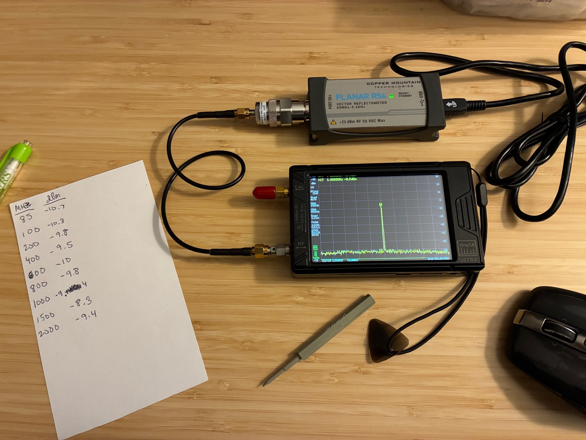 The above photo shows the measurement setup with hand notes for the observed power level (marker readout). Measurements were made on High source power at the R54 (expecting approximately -10 dBm output level).