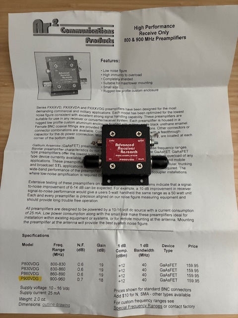 34) Advanced Receiver Research GaAs FET LNA P900VDG. Operates from 10-16VDC, BNC jacks for input and output. See post for details. (This amplifier likely needs active device replaced.)