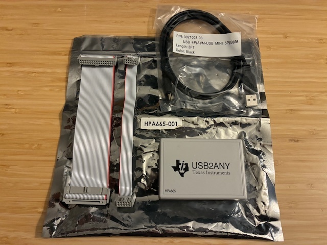 44) Texas Instruments USB2ANY interface module. The USB2ANY interface adapter is a tool intended to allow a computer to control an evaluation module (EVM) via a USB connection. USB2ANY supports multiple popular protocol interfaces and provides 3.3-V and 5-V power supplies. Appears to be new, with all accessories and original ESD bag PN label. I have not used this interface (untested).