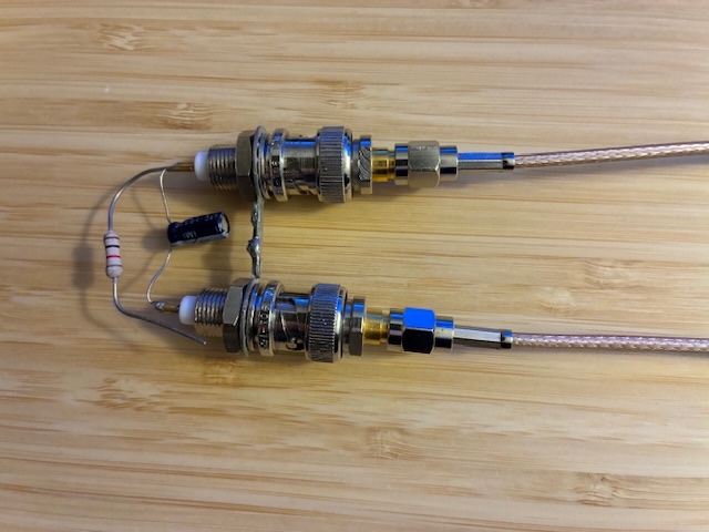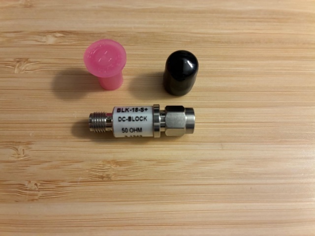 Above 1 MHz, a Mini-Circuits BLK-18-S+ SMA connectorized unit is available to perform the needed AC coupling function on the output of the HP1121A probe. A BNC to SMA adapter is used to connect to the probe's BNC-M output connector.