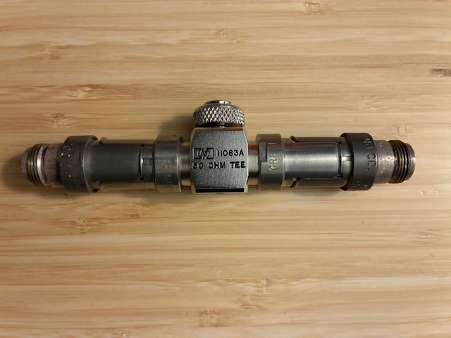 The idea for checking the high frequency probe's 3 dB point would involve use of a HP11063A 50 Ohm Tee along with some GR adapters to yield N-female interfaces and N to SMA adapters after that. The HP11063A probe adapter has a special mounting point on the mid-section that allows insertion of the HP1121A probe tip into it to make contact with the RF center conductor within. The RF return/shield is also connected via a slotted outer line with tightening nut to hold the probe firmly in place.