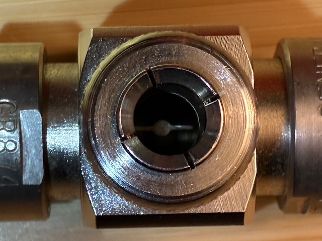 Here is a top down view of the probe insertion point showing the small through line coaxial line contact within.