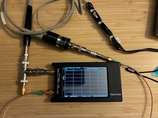 The setup thereafter uses the NanoVNA-H4 vector network analyzer to 1) calibrate the through line frequency response, 2) move the through line output coaxial cable to connect the VNA CH1 port to the HP1121A output BNC (with attached DC block per HP1121A manual), and 3) install a 50 Ohm termination on the HP11063A through line output port connection. Here's a photo of the completed setup with probe installed into the tap.