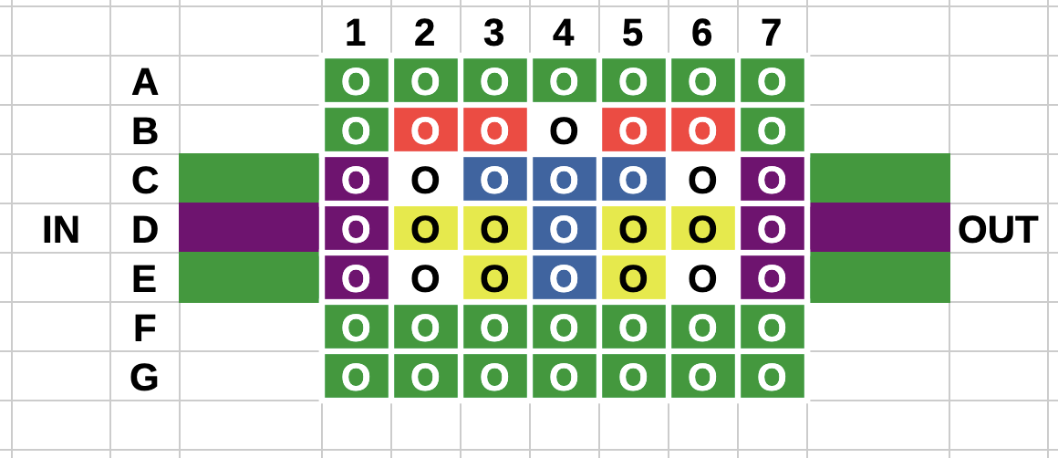 Like colors are connected electrically. The five spaces with white backgrounds are all open circuits (not connected to each other.)