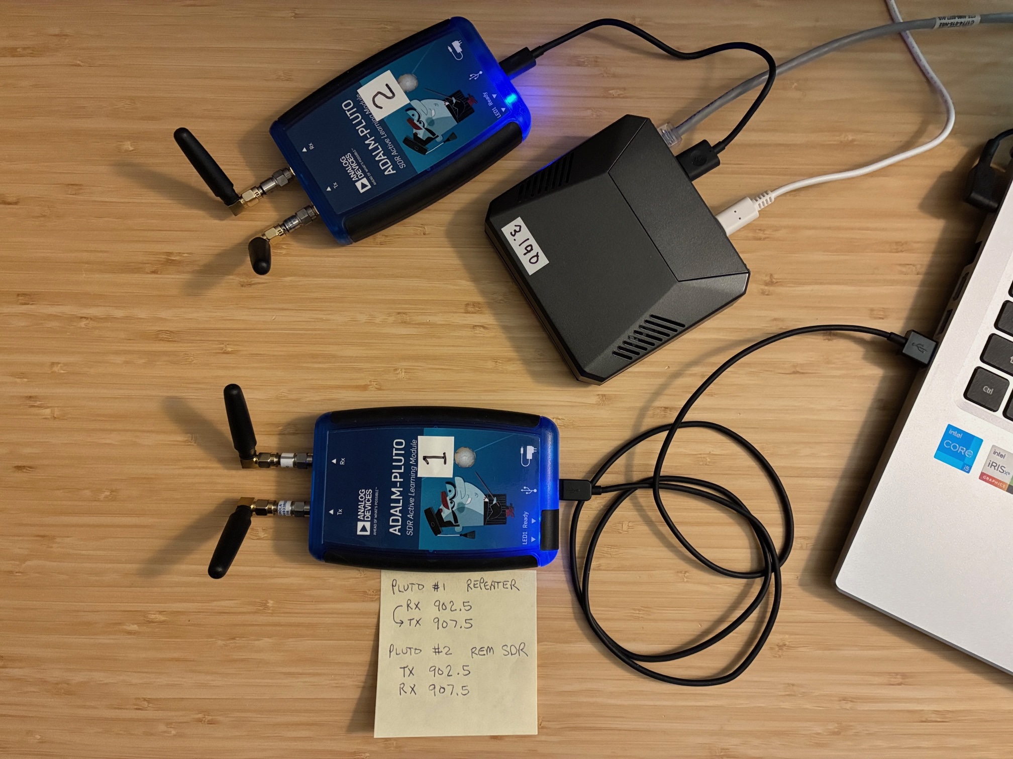 The photo below shows the Remote SDR Pluto (#2) & Raspberry Pi 5 at the top of the screen and the second Pluto (#1) connected via USB to a laptop PC. The post-it note calls out each Pluto's transmit and receive frequencies. Both Pluto SDR have their mini-antennas attached to both TX and RX ports.