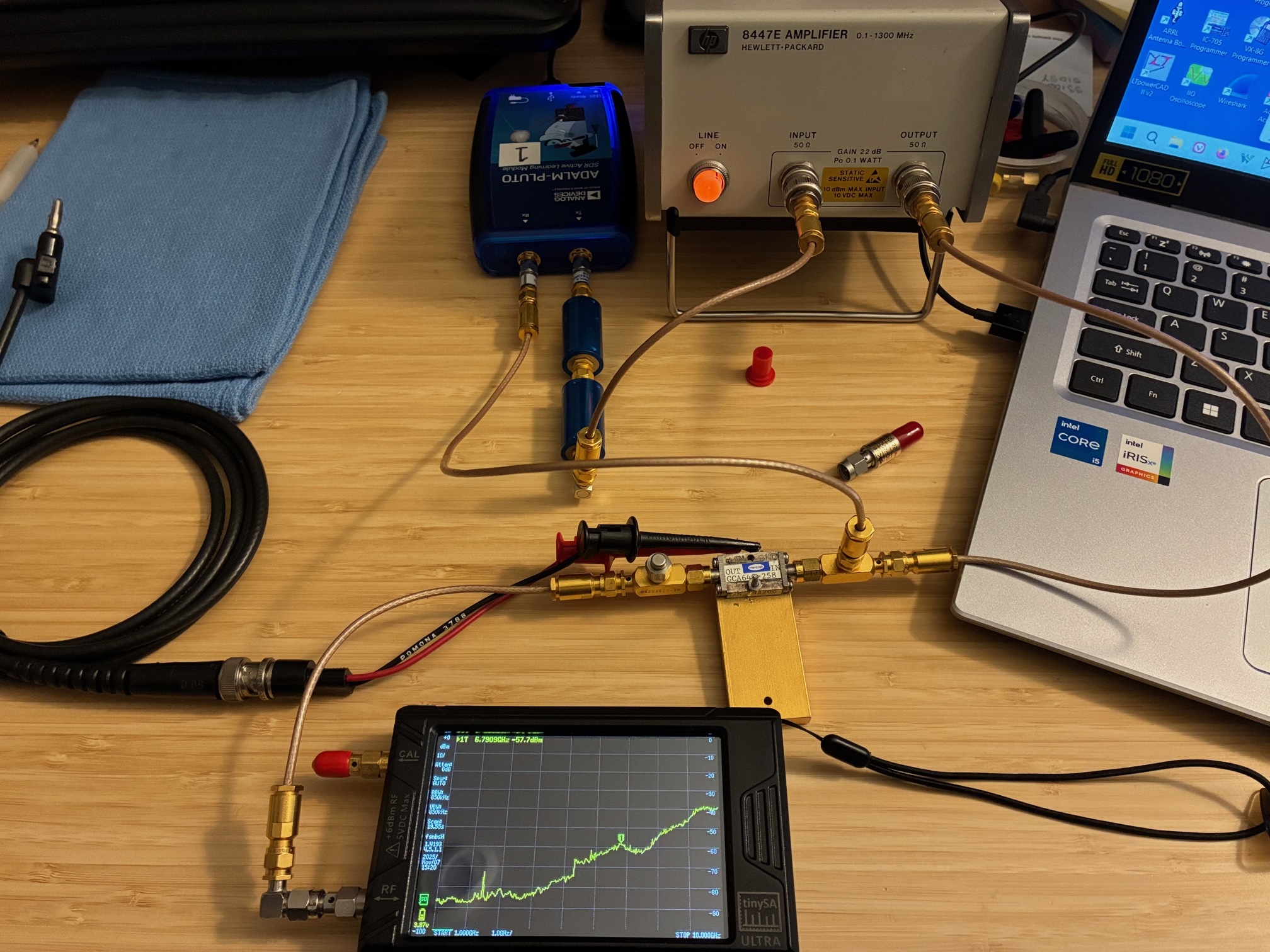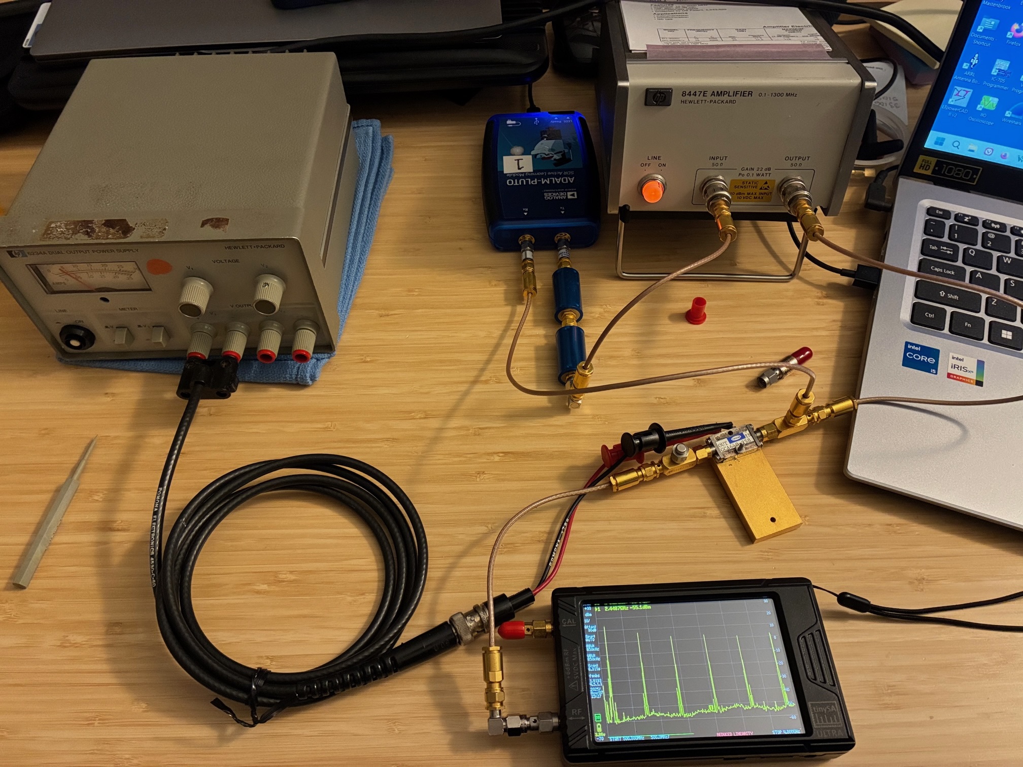 The setup shows the Pluto SDR signal source, the HP and LP filters, the ZFL-2000 RF amplifier (in the HP8447 case), a Omni-Spectra 20 dB sampler, the Herotek GCA640-258 comb generator with power leads connected, another Omni-Spectra 20 dB sampler (terminated), and a RF cable leading over to the TinySA-Ultra spectrum analyzer. DC power is off. (Ignore the TinySA-Ultra screen as it is set to an out of band upper frequency limit and the noise floor raises to a crazy level at those frequencies.)