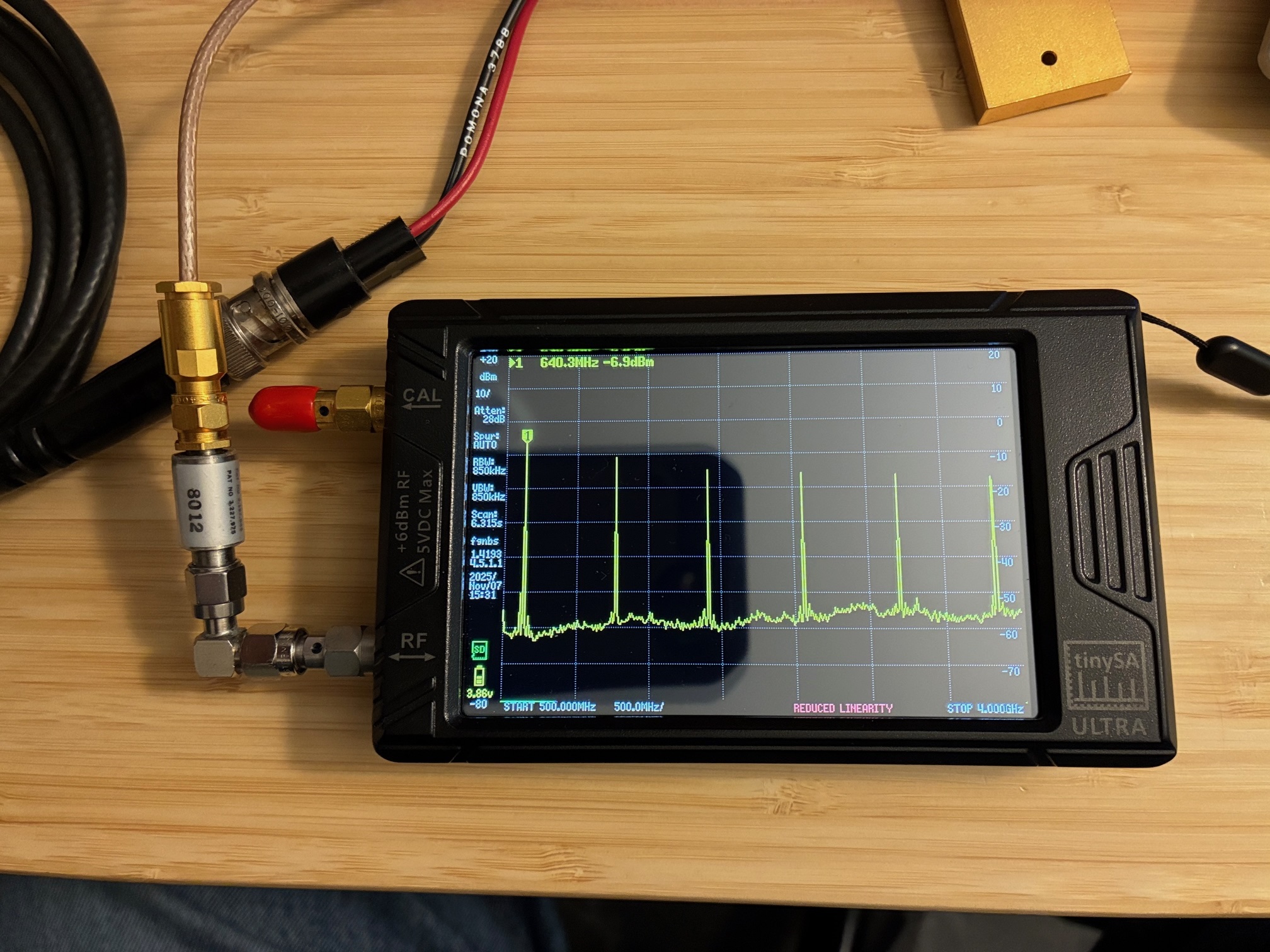 With that (hooking up the +5 VDC supply and changing setting on the TinySA-Ultra), we're ready to power up the system and see if the comb generator works.