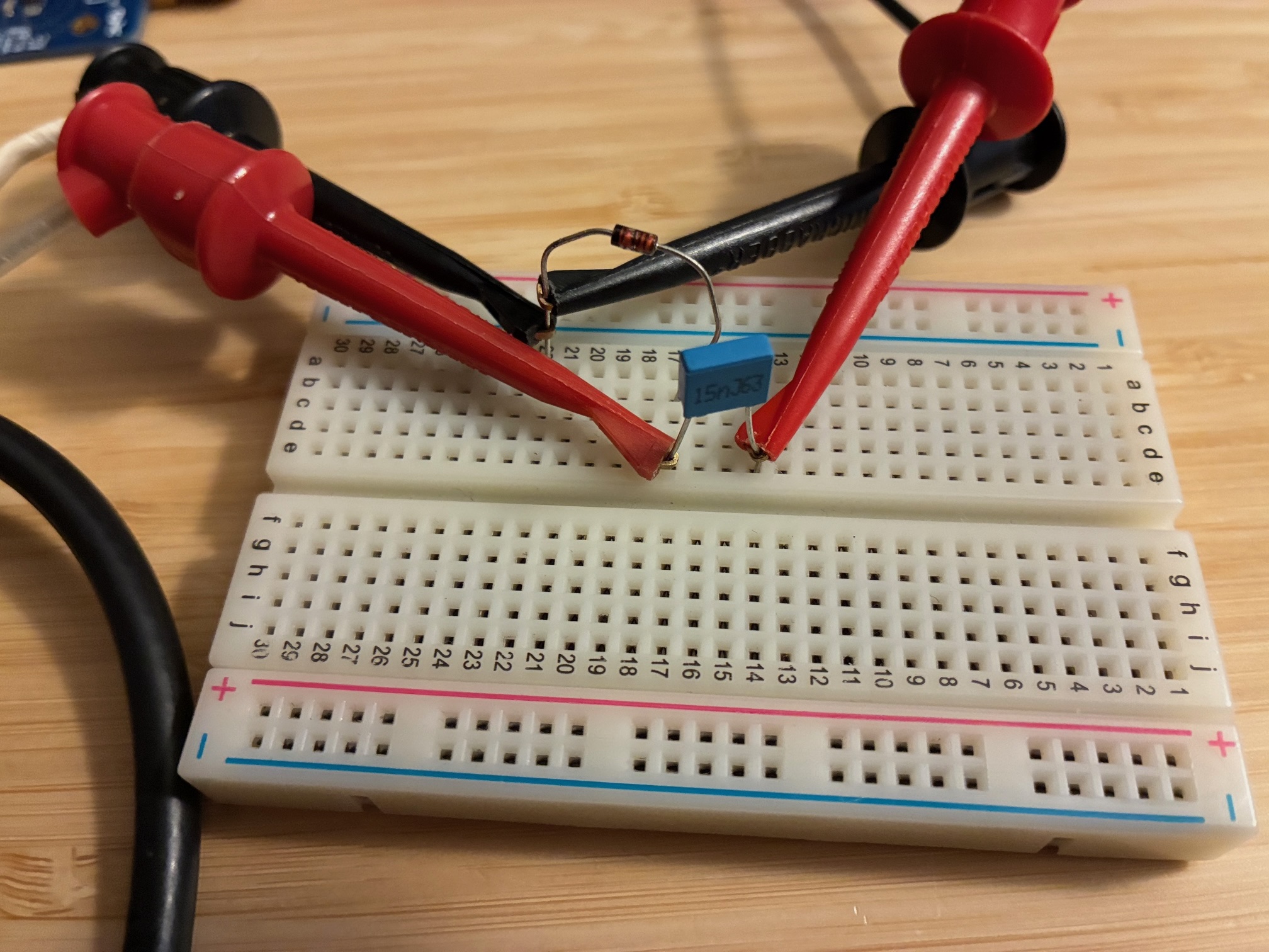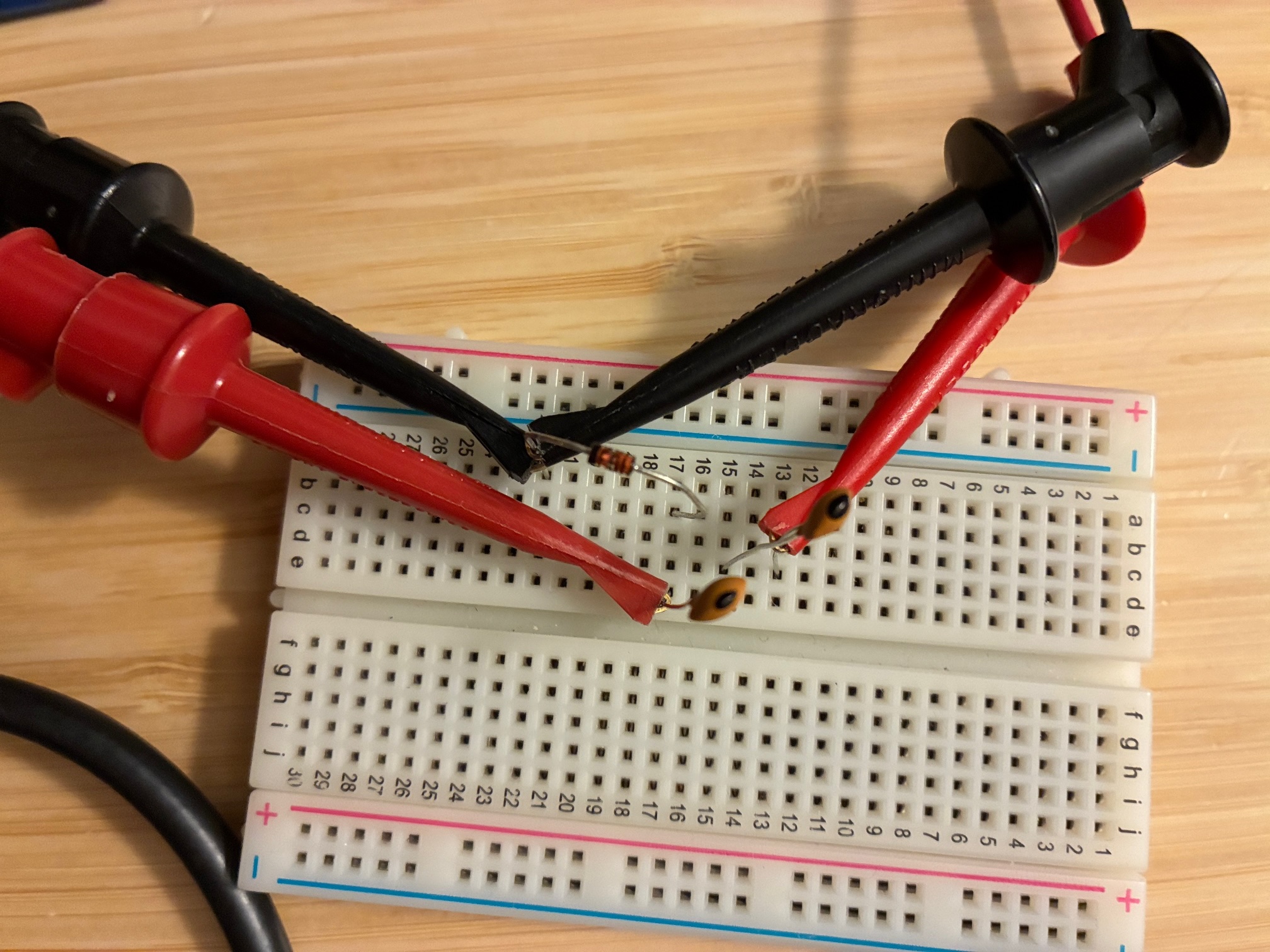 Swapping in the new capacitor and diode yielded this setup at the protoboard:
