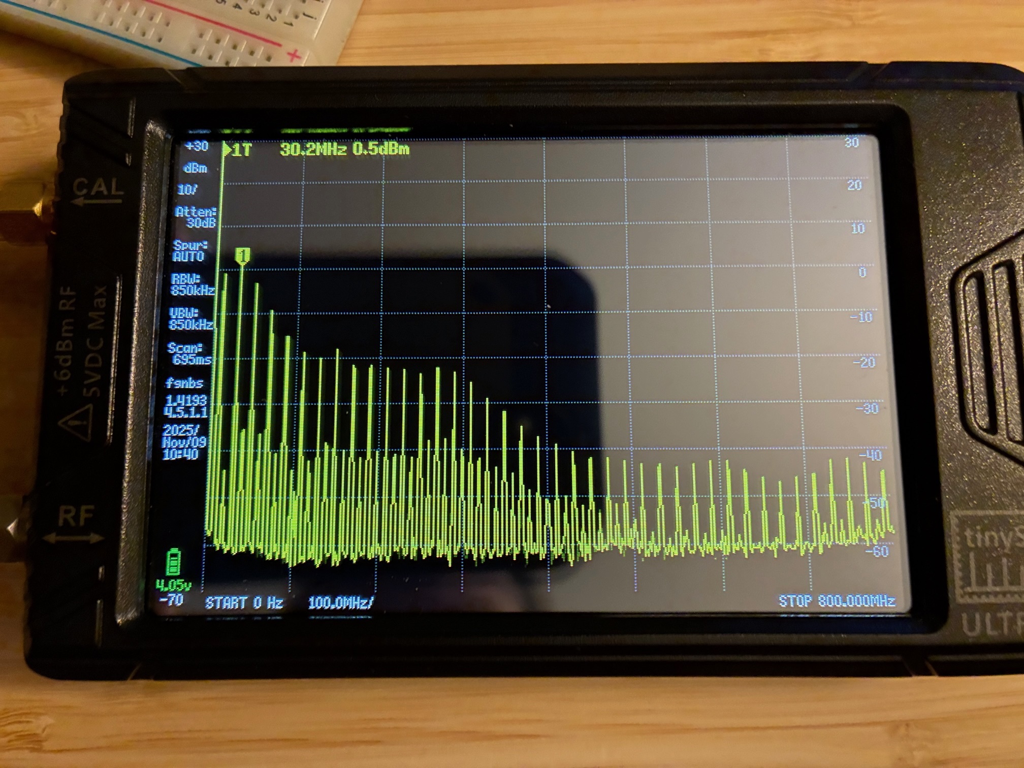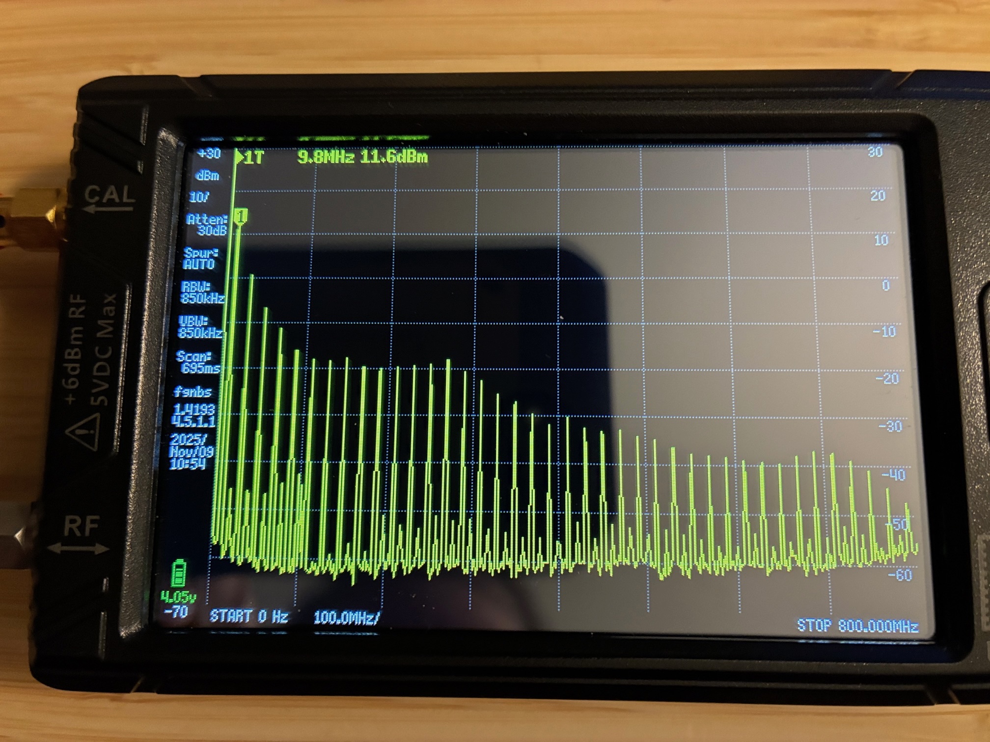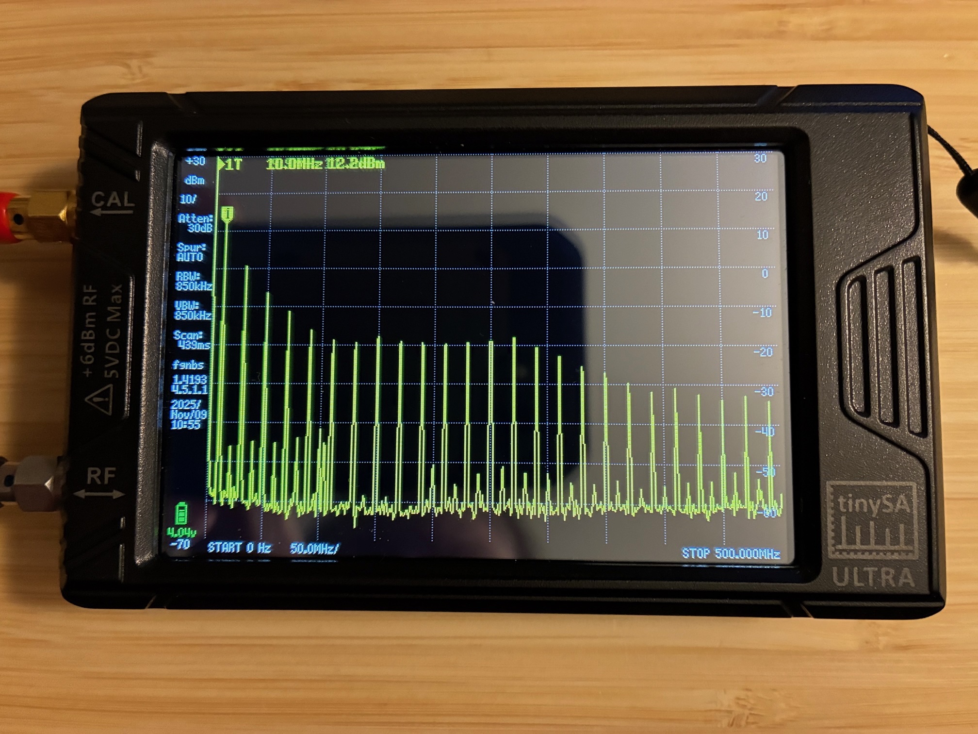 A closer shot of the TinySA-Ultra display shows a reasonable comb up to 800 MHz. Not too bad for around 25 cents of passive components!