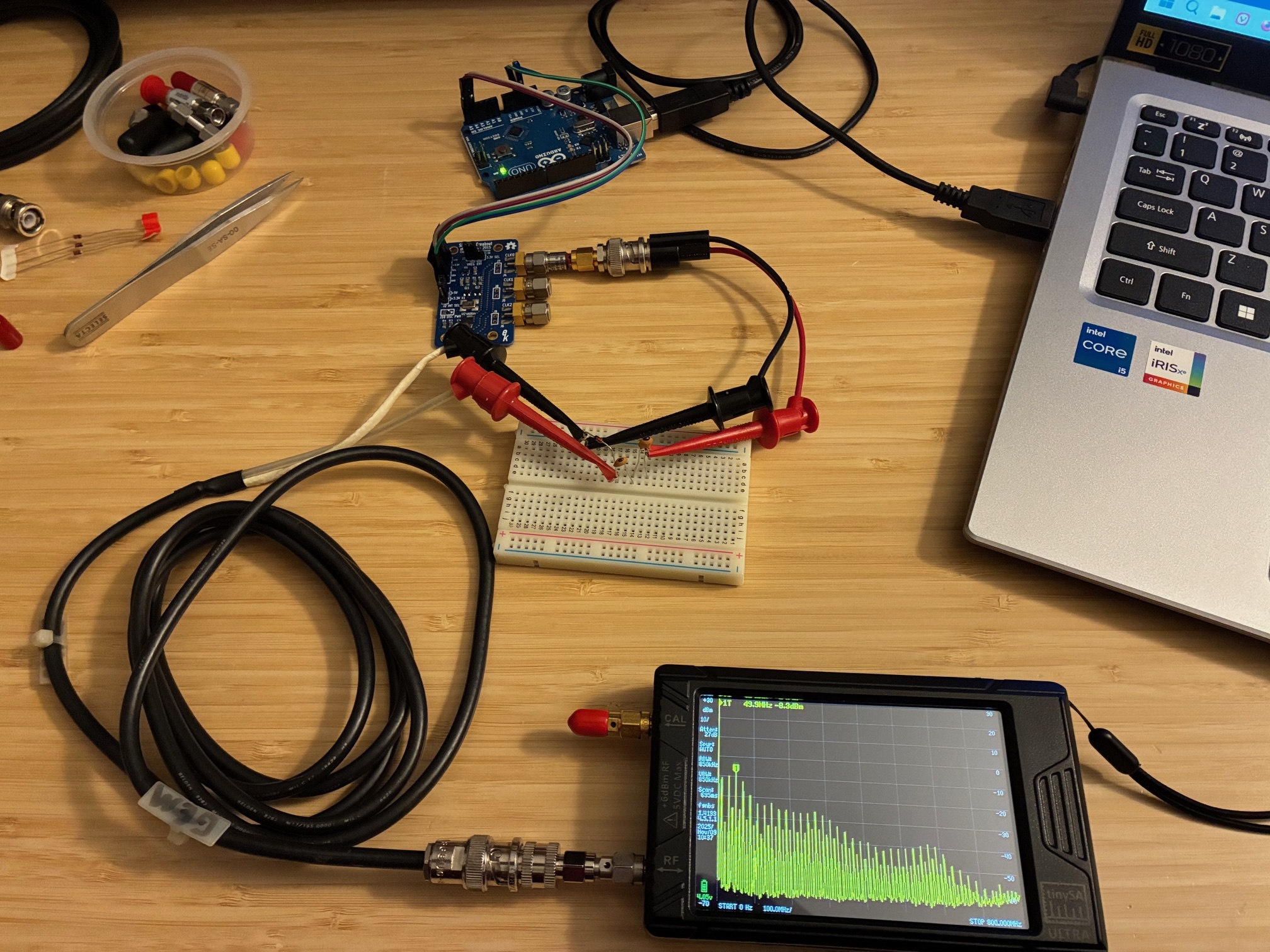 Below is a shot of the overall test setup, with UNO controlled SI5351A clock source, CLK-0 clip leaded to input series capacitor and output clip leads running from shunt 1N4148 diode to the TinySA-Ultra spectrum analyzer. A comb of RF signals is present on the SA display.