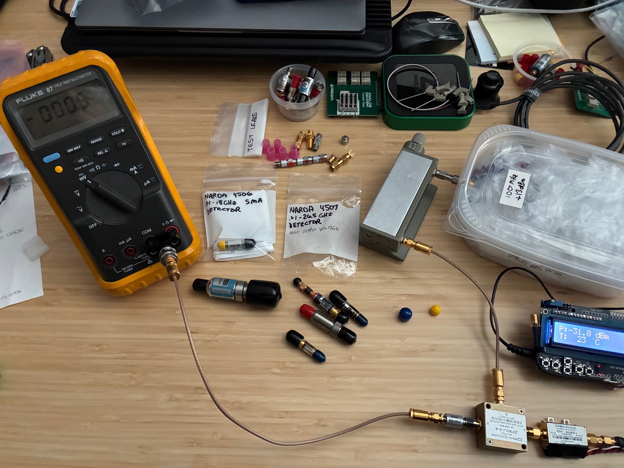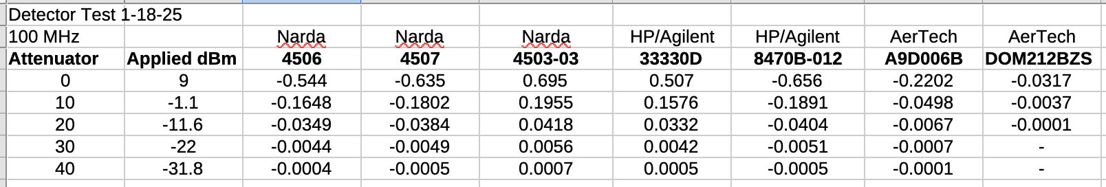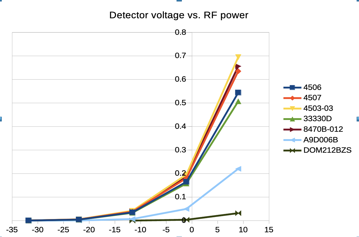 The decision to test at only a single frequency of 100 MHz greatly simplified the setup, but ultimately did not allow proper characterization of one or two of the detectors (which cover higher frequencies). You'll quickly see which of the detectors had super-low output at 100 MHz.