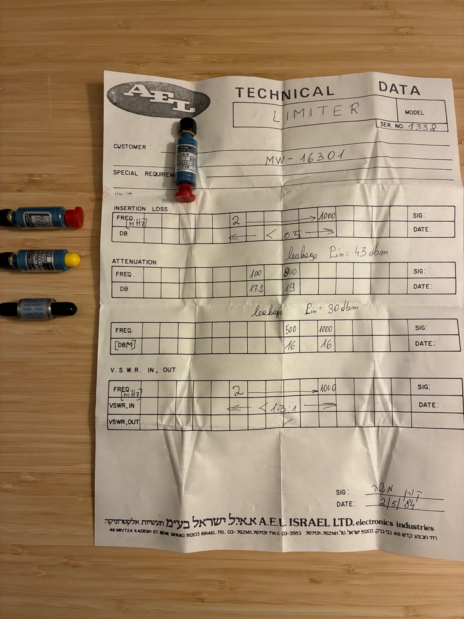 A look through one of the small modular RF components cases yielded four limiters to consider. All use SMA connectors. Three are all the same part number (AEL MW16301) and the fourth is a Hewlett Packard 5086-7261 (possibly pulled from a HP spectrum analyzer). One of the AEL limiters included a final-test/measured test data sheet. A quick internet search for AEL MW16301 yielded zip/nada...