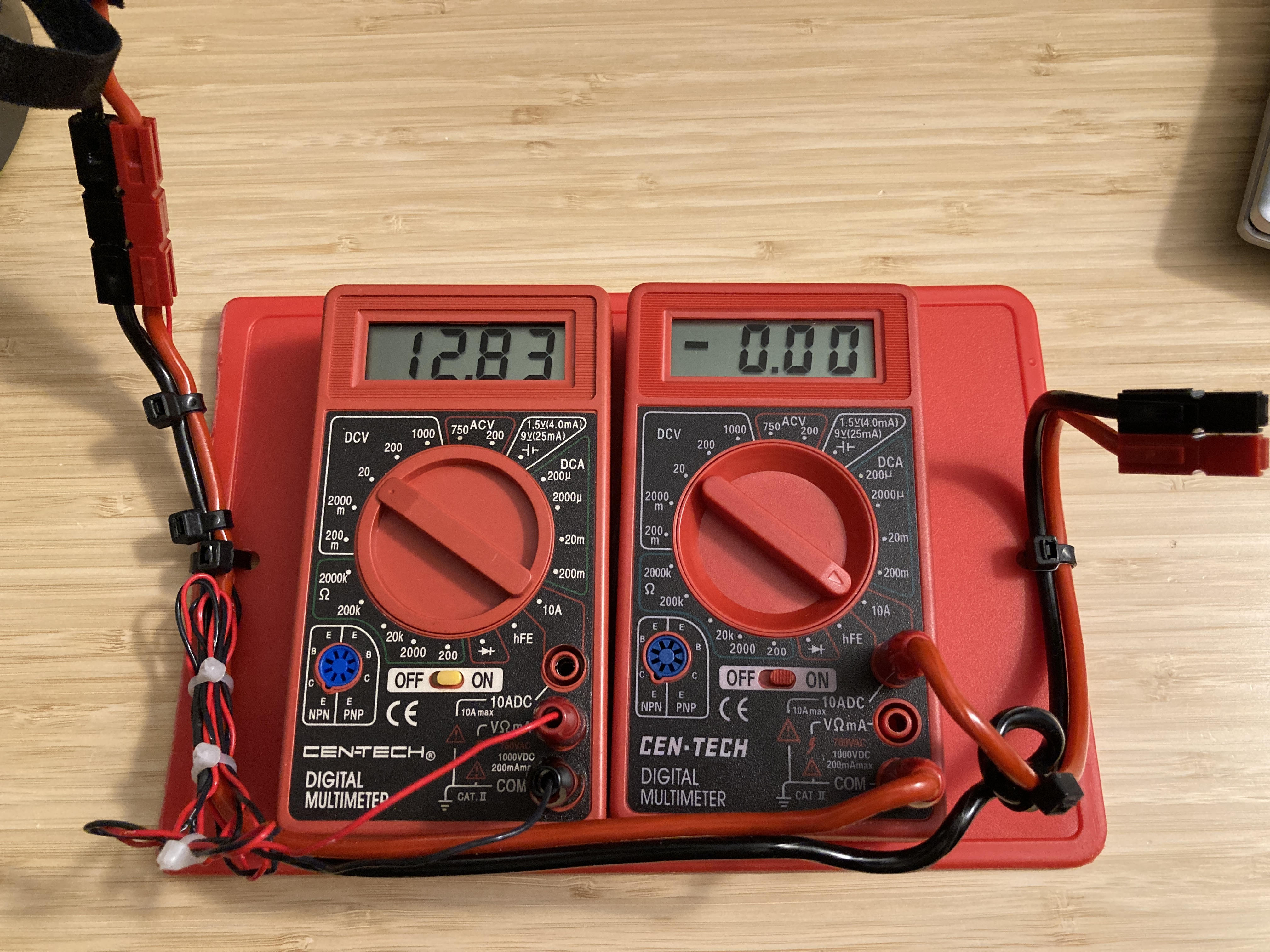 Solar voltage and current monitor with power pole input/output connections. Uses two free with coupon Harbor Freight digital multimeters velcro mounted onto a dollar store plastic cutting board. Attached the velcro onto the board and backs of the two DMM (allowing changing batteries easily) and drilled a few holes to keep the wiring in place. The thicker, #12 wire carries the series connection (current) while the smaller gauge wire monitors the parallel circuit (voltage). Used some surplus banana plugs to replace the supplied cheap/tiny-wire test probes for the meter connections. Additional strips of adhesive-backed velcro holds the V/I monitor board inside a plastic case for storage. Works well with the solar panels and the field ham radio battery system.