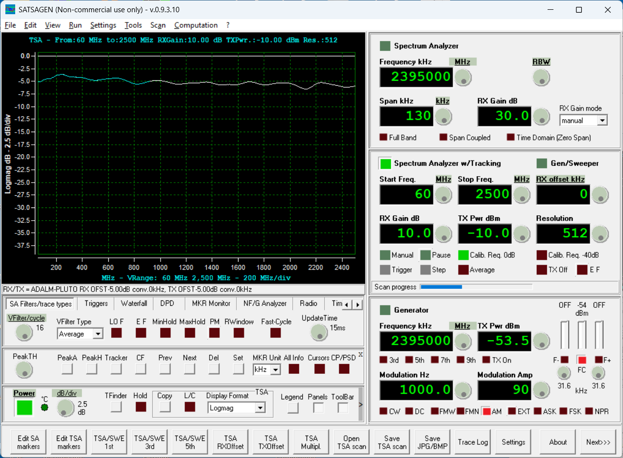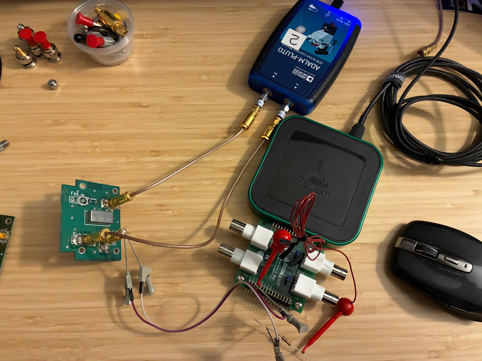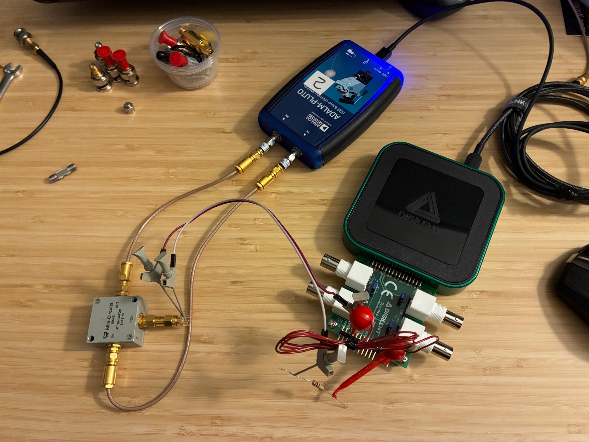 We'll use the ADALM-Pluto SDR controlled by SATSAGEN to generate the test RF signal and monitor the resultant attenuated signal level. A Digilent Analog Discovery 3 module with breakout board will be used to inject DC bias into the ZFAS-15 device. Digilent Waveforms control software will be used to control the output voltage (no LabVIEW today as this is a quick, one-time test).