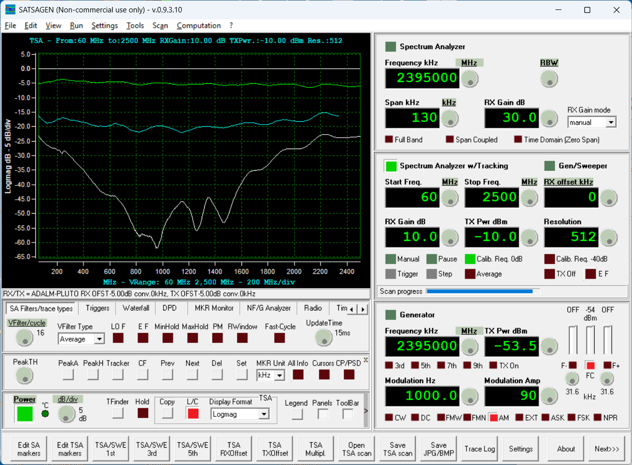 Ready to test - starting with the power off insertion loss measurement. The Pluto SDR covers down to 60 MHz, so we'll use this as a lower frequency limit. The measured value is expected to be high-attenuation due to all of the diodes being fully off, non-conducting.