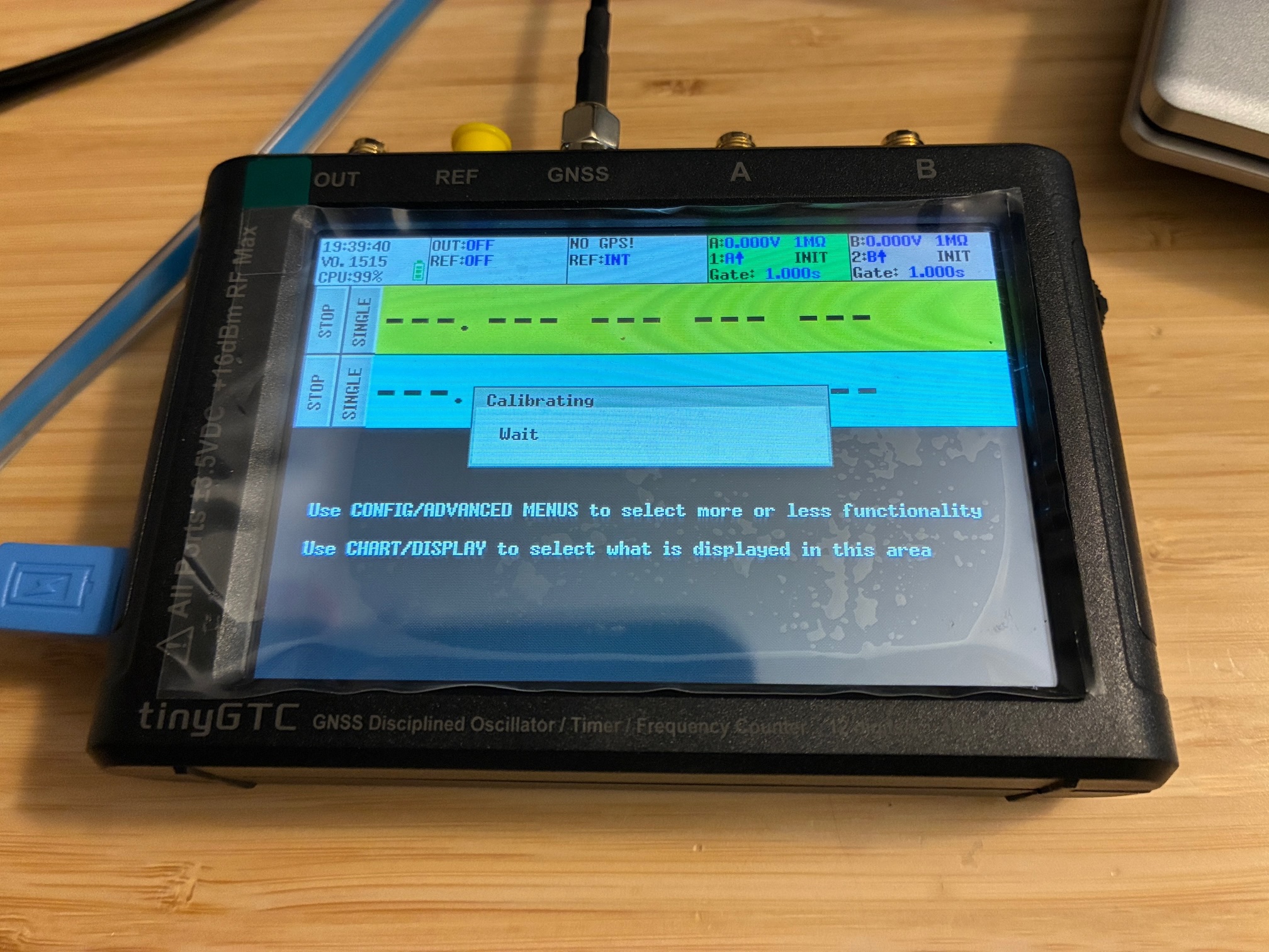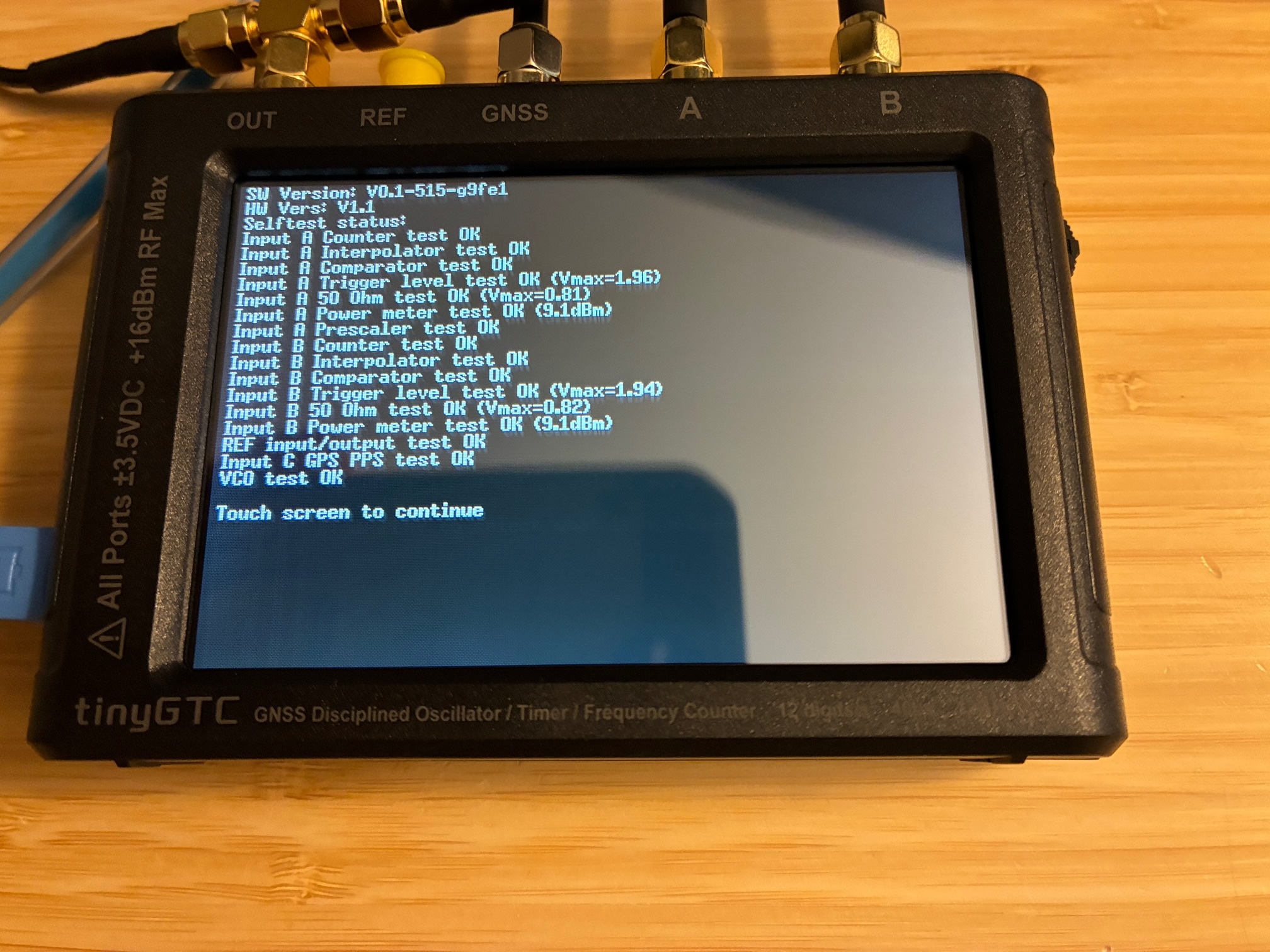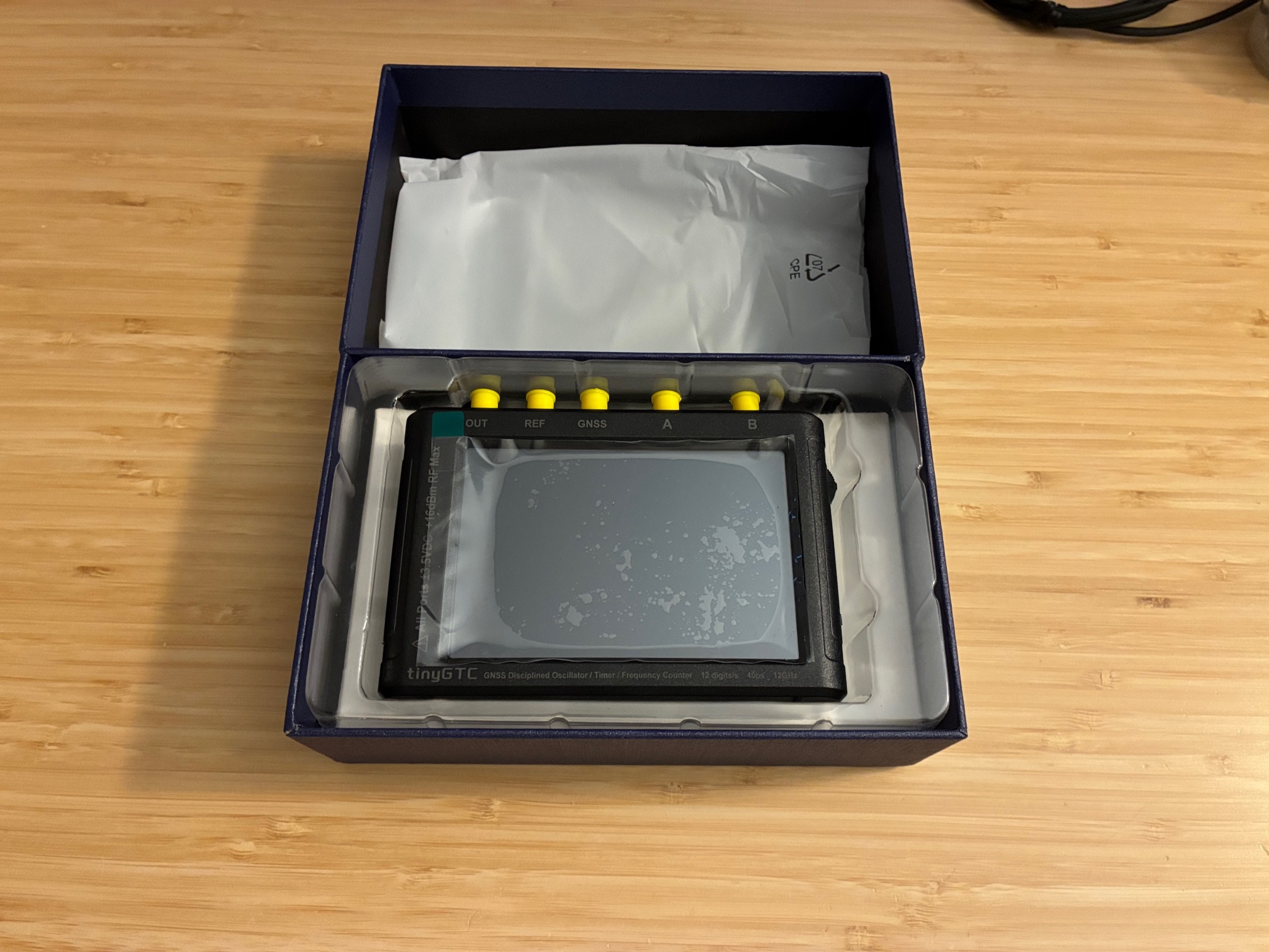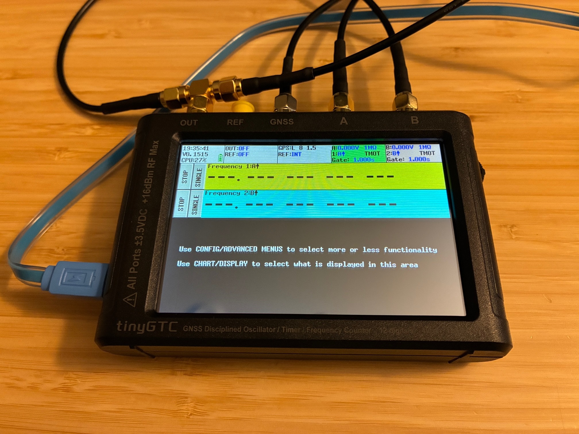 The TinyGTC is a dual Timer/Counter with built-in GPSDO with up to two clock outputs, it is a portable, battery operated, five SMA connectors, one USB connector device with a 4 inch display. It has a on/off switch, a jog wheel for when there is a problem with display touch and a SD card slot.