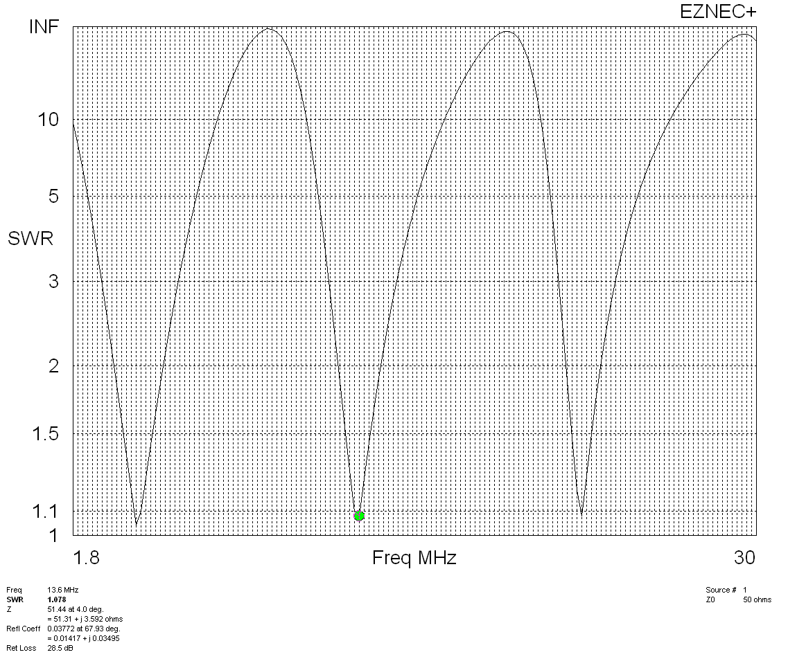 A second way to tune the counterpoise is to disconnect it from the antenna, and feed it like a low dipole. Adjust it for resonance. Frequency SensitivityMultiband systems present a unique problem. The counterpoise or radial system ideally must present a low common mode impedance across every operating band. This is an extremely difficult goal if multiple bands are present. Frequency sensitivity of a counterpoise can be modeled by placing the counterpoise a few feet above a perfect ground, inserting a source in series with a 50-ohm load in a short very-thick vertical wire, and attaching the counterpoise to the top. By making a 50-ohm SWR sweep, a graphical representation of low and high common mode impedances appears. The vertical wire slightly skews frequency lower, but overall we get a good idea of frequency sensitivity and problem bands. Care must be exercised looking at the results. Reactance is not quite as much problem as high resistance, because reactance can be "compensated out" with changes in antenna tuning. High resistance will increase feed impedance regardless of antenna length corrections or compensations, but will NOT necessarily increase system loss. High SWR indicates bands or ranges where feedline common mode or stress on feedline chokes will be problematic. Here is a 1.8-30 MHz sweep of a 50-ft long single-wire counterpoise: