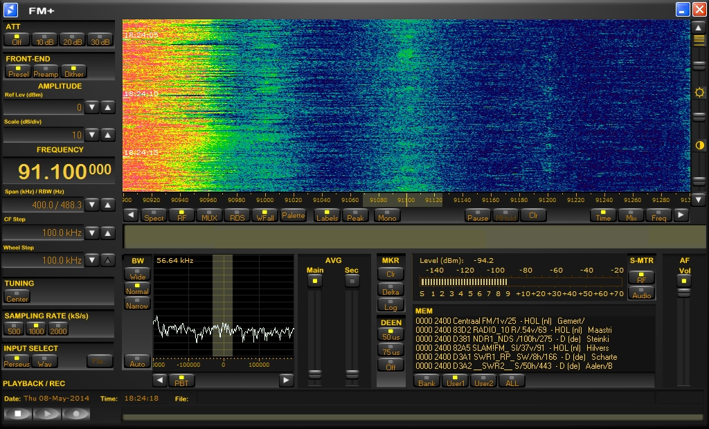 Thursday, May 1st 2014 Perseus FM+ hardware with Winrad, RDS spy and VAC.