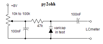 O varicap que utilizei é um de corpo preto faixa branca com 5pF em 8V e 25pF com 0V. Um SMD de corpo cinza com faixa laranja tambem dá esta variação. Eu retirei eles de seletores de canais de sucata, apesar que o de corpo preto eu tenho comprado no comercio.