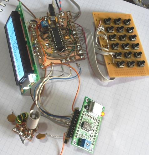 Montei o PIC16F628A em um soquete de 18 pinos, soldado a duas trilhas cortadas de uma placa de periferico de PC, a esquerda da foto temos o LM317 TO220 (fonte de 3,3V) e o 78L05 com o trimpot de ajuste de contraste e o resistor limitador do back light. As 3 primeiras conexões acima a esquerda são do encoder e em sequencia 9 terminais para o teclado. A direita temos as 3 conexões de dados para o AD9850, os resitores de 10k limitam a tensão de comando, pois o PIC envia sinais a 5V e o AD9850 trabalha com 3,3V. Sem estes resistores o circuito funciona mas fica maluco rerere !